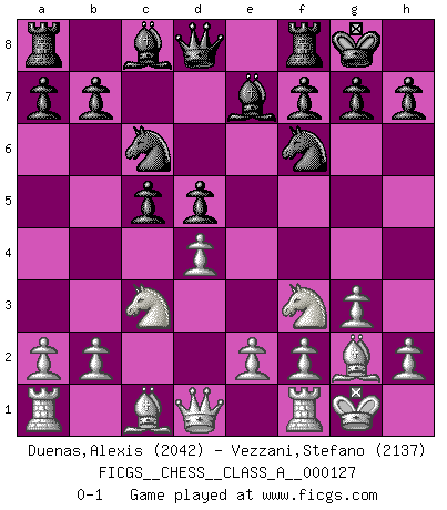 Last move : 0-1 2012 September 28 5:50:54 [Event "FICGS__CHESS__CLASS_A__000127"] [Site "FICGS"] [Date "2012.09.22"] [Round "1"] [White "Duenas,Alexis"] [Black "Vezzani,Stefano"] [Result "0-1"] [WhiteElo "2042"] [BlackElo "2137"] 1.d4 d5 2.c4 e6 3.Nc3 c5 4.cxd5 exd5 5.Nf3 Nc6 6.g3 Nf6 7.Bg2 Be7 8.O-O O-O 0-1 QGD : Tarrasch, Prague variation, 7...Be7 Kingside Castling by player White (move 8) Kingside Castling by player Black (move 8) Player Black won this chess game. Follow this game move after move (download)Chess is a fairy tale of 1001 blunders. (Savielly Tartakower) Wenn Du einsam bist, wenn Du Dich in der Welt wie ein Fremder fühlst, spiele Schach. Das wird Deinen Geist erheben und Dein Ratgeber im Kampf sein. (Aristoteles) La enorme capacidad mental, en la que sin ella no puede un jugador de Ajedrez existir, es demasiado requerida por el Ajedrez al grado de que nunca podrá liberar su mente de este juego. (Albert Einstein) Votre seul travail dans les ouvertures est d'obtenir un milieu de partie jouable. (Lajos Portish) Creativity is inventing, experimenting, growing, taking risks, breaking rules, making mistakes, and having fun. (Mary Lou Cook)