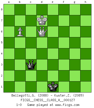 Last move : 1-0 2013 November 2 7:55:55 [Event "FICGS__CHESS__CLASS_A__000127"] [Site "FICGS"] [Date "2012.09.22"] [Round "1"] [White "Bellegotti,Giorgio"] [Black "Kuster,Zeljko"] [Result "1-0"] [WhiteElo "2088"] [BlackElo "2089"] 1.e4 c5 2.Nf3 e6 3.d4 cxd4 4.Nxd4 Nc6 5.Nc3 a6 6.Be3 Qc7 7.Qd2 Nf6 8.O-O-O Bb4 9.f3 O-O 10.a3 Be7 11.g4 b5 12.h4 Rb8 13.h5 Ne5 14.g5 Ne8 15.Nf5 exf5 16.Nd5 Qd8 17.exf5 Nxf3 18.Qf2 Bxg5 19.Qxf3 Bb7 20.h6 Bxd5 21.Rxd5 Qe7 22.Rd3 g6 23.fxg6 hxg6 24.Bxg5 Qxg5+ 25.Kb1 Rb6 26.Rxd7 Qf6 27.h7+ Kh8 28.Qa8 b4 29.axb4 Rxb4 30.b3 Rh4 31.Rxh4 Qxh4 32.Bc4 Qe1+ 33.Kb2 Qe5+ 34.c3 Qf4 35.Qxa6 Qf2+ 36.Ka3 Qf3 37.Kb4 Nf6 38.Rxf7 Rxf7 39.Bxf7 Kxh7 40.c4 g5 41.Qa7 Kh6 42.Qb6 Kg7 43.Qc7 Kh6 44.Be6 g4 45.Bc8 Ne4 46.Qe5 Nf6 47.Qe7 Kg6 48.Bb7 Qf2 49.Qe6 g3 50.Kb5 Kg5 51.Qc6 Kg6 52.Qf3 Kf7 53.c5 Ke6 54.b4 Ke7 55.Bc6 Qe1 56.Ka5 Qe5 57.Ka6 Nd7 58.Bxd7 Kxd7 59.Qf7+ Kc8 60.Qg8+ Kd7 61.Qh7+ Ke6 62.c6 Qd5 63.Qg8+ Kd6 64.Qxd5+ Kxd5 65.c7 g2 66.c8Q g1Q 67.Qc3 Qg6+ 68.Ka5 Qg1 69.Qd3+ Ke6 70.Qa6+ Kd5 71.Qb5+ Ke4 72.Qc6+ Kd3 73.Qd5+ Ke2 74.Qe4+ Kd2 75.b5 Qa1+ 76.Kb6 Qf6+ 77.Kc7 Qf7+ 78.Kd6 Qf6+ 79.Kd7 Qf7+ 80.Qe7 Qf5+ 81.Kc6 Qc8+ 82.Qc7 Qa8+ 83.Kd7 Ke1 84.b6 Qe4 85.Qc6 Qh7+ 86.Kc8 Qf5+ 87.Kc7 Qf7+ 88.Qd7 Qf4+ 89.Qd6 Qf7+ 90.Kc6 Qe8+ 91.Qd7 Qg6+ 92.Kc7 Qg3+ 93.Qd6 Qg7+ 94.Kc6 Qc3+ 95.Kd7 1-0 Sicilian : Taimanov variation Queenside Castling by player White (move 8) Kingside Castling by player Black (move 9) 10 pieces endgame at move 39 : White KQBPPP , Black KQNP WHITE : King + 1 Queen 1 Bishop 3 Pawns BLACK : King + 1 Queen 1 Knight 1 Pawn 9 pieces endgame at move 39 : White KQBPP , Black KQNP WHITE : King + 1 Queen 1 Bishop 2 Pawns BLACK : King + 1 Queen 1 Knight 1 Pawn 8 pieces endgame at move 58 : White KQBPP , Black KQP WHITE : King + 1 Queen 1 Bishop 2 Pawns BLACK : King + 1 Queen 1 Pawn 7 pieces endgame at move 58 : White KQPP , Black KQP WHITE : King + 1 Queen 2 Pawns BLACK : King + 1 Queen 1 Pawn 6 pieces endgame at move 64 : White KQPP , Black KP WHITE : King + 1 Queen 2 Pawns BLACK : King + 1 Pawn 5 pieces endgame at move 64 : White KPP , Black KP WHITE : King + 2 Pawns BLACK : King + 1 Pawn Promotion Queen by player White (move 66) Promotion Queen by player Black (move 66) Player White won this chess game. Follow this game move after move (download)The game of Chess is not merely an idle amusement; several very valuable qualities of the mind are to be acquired and strengthened by it, so as to become habits ready on all occasions; for life is a kind of Chess. (Benjamin Franklin) Ich habe Kasparov in Rente geschickt. (Veselin Topalov) Todo se encuentra en un estado de flujo y esto incluye al mundo del Ajedrez. (Mikhail Botvinnik) Un footballeur joue avec ses pieds, parfois avec sa tête. Un joueur d'échecs ne joue qu'avec sa tête. Et quand il ne joue plus, il meurt. (Jacob Murray) A person who never made a mistake never tried anything new. (Albert Einstein)