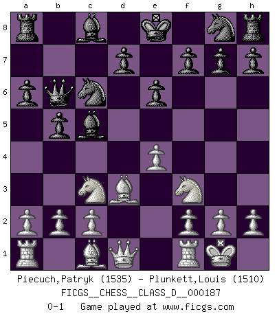 Last move : 0-1 2012 November 6 10:19:40 [Event "FICGS__CHESS__CLASS_D__000187"] [Site "FICGS"] [Date "2012.09.23"] [Round "1"] [White "Piecuch,Patryk"] [Black "Plunkett,Louis"] [Result "0-1"] [WhiteElo "1535"] [BlackElo "1510"] 1.e4 c5 2.Nf3 e6 3.d4 cxd4 4.Nxd4 a6 5.Nc3 b5 6.Bd3 Qb6 7.Nf3 Bc5 8.O-O Nc6 0-1 This chess game has been lost on time (started : 2012.09.23 0:48:21) Sicilian : Kan, 5.Nc3 Kingside Castling by player White (move 8) Player Black won this chess game. Follow this game move after move (download)Tactics flow from a superior position. (Bobby Fischer) Über die Verhaftung Bobby Fischers: Warum es die Bush-Administration für nötig befindet einen 61 Jahre alten Mann zu hetzten, der für niemanden ausser sich selbste eine Gefahr darstellt ist ein Rätsel. (Nigel Short) El Ajedrez es en su esencia, un juego. En su forma, un arte. Y en su ejecución, una ciencia. (Baron Tassilo) Même si l'adversaire joue le coup analysé précédemment, recommencez l'analyse en voyant la nouvelle position. Première règle de Blumenfeld The beginning is the most important part of the work. (Plato)