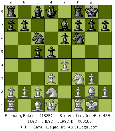 Last move : 0-1 2012 November 19 22:52:31 [Event "FICGS__CHESS__CLASS_D__000187"] [Site "FICGS"] [Date "2012.09.23"] [Round "1"] [White "Piecuch,Patryk"] [Black "Strohmeier,Josef"] [Result "0-1"] [WhiteElo "1535"] [BlackElo "1429"] 1.d3 d5 2.Nf3 Nf6 3.g3 e6 4.Bg2 c5 5.O-O Be7 6.Nbd2 O-O 7.e4 Nc6 0-1 This chess game has been lost on time (started : 2012.09.23 0:48:21) Mieses Opening Kingside Castling by player White (move 5) Kingside Castling by player Black (move 6) Player Black won this chess game. Follow this game move after move (download)Chess teaches you to control the initial excitement you feel when you see something that looks good and it trains you to think objectively when you're in trouble. (Stanley Kubrick) Ein typischer, sehr verbreiteter Gedankenschädling ist der, daß der betreffende Amateur von der Annanhme ausgeht, daß jeder einzelne Zug etwas zu leisten habe. (Aaron Nimzowitsch) El Ajedrez es un cuento de Hadas de las 1001 metidas de pata. (Savielly Tartakower) A chaque perte on perd un peu de soi. (Joël Lautier) I know the human being and fish can coexist peacefully. (George W. Bush, Saginaw sept. 29, 2000)