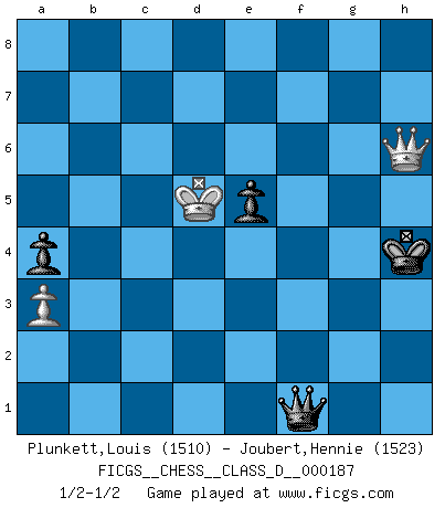 Last move : 1/2-1/2 2013 February 1 10:58:47 [Event "FICGS__CHESS__CLASS_D__000187"] [Site "FICGS"] [Date "2012.09.23"] [Round "1"] [White "Plunkett,Louis"] [Black "Joubert,Hennie"] [Result "1/2-1/2"] [WhiteElo "1510"] [BlackElo "1523"] 1.d4 Nf6 2.Nc3 g6 3.e4 d6 4.h3 Bg7 5.Be3 O-O 6.Qd2 Nbd7 7.Bh6 e5 8.Bxg7 Kxg7 9.g4 Nb6 10.O-O-O Nbd7 11.Be2 Kg8 12.h4 Nb6 13.dxe5 Nxg4 14.Bxg4 Bxg4 15.f3 Bh5 16.Qe2 Qe7 17.exd6 cxd6 18.Qf2 f5 19.Nd5 Nxd5 20.exd5 Rac8 21.Ne2 Qe5 22.c3 Rc4 23.Kb1 Re8 24.Ng3 f4 25.Nxh5 Qxh5 26.Qf1 Rc5 27.Re1 Qf5+ 28.Ka1 Re3 29.Rg1 Rxd5 30.Rg5 Qe6 31.Rg1 Rxe1+ 32.Qxe1 Qxe1+ 33.Rxe1 Kf7 34.a3 h6 35.Kb1 g5 36.hxg5 hxg5 37.Kc2 a5 38.b3 b5 39.Re4 Re5 40.Kd3 Ke6 41.c4 bxc4+ 42.bxc4 Kf5 43.Kd4 a4 44.Rxe5+ dxe5+ 45.Kd5 g4 46.fxg4+ Kxg4 47.c5 f3 48.c6 f2 49.c7 f1Q 50.c8Q+ Kg3 51.Qg8+ Kh4 52.Qh8+ Kg4 53.Qg7+ Kh4 54.Qh6+ Kg4 55.Qg6+ Kh4 56.Qh6+ Kg4 57.Qg6+ Kh4 58.Qh6+ 1/2-1/2 Queen's pawn game Kingside Castling by player Black (move 5) Queenside Castling by player White (move 10) 10 pieces endgame at move 44 : White KRPPP , Black KPPPP WHITE : King + 1 Rook 3 Pawns BLACK : King + 4 Pawns 9 pieces endgame at move 44 : White KPPP , Black KPPPP WHITE : King + 3 Pawns BLACK : King + 4 Pawns 8 pieces endgame at move 46 : White KPPP , Black KPPP WHITE : King + 3 Pawns BLACK : King + 3 Pawns 7 pieces endgame at move 46 : White KPP , Black KPPP WHITE : King + 2 Pawns BLACK : King + 3 Pawns Promotion Queen by player Black (move 49) Promotion Queen by player White (move 50) This chess game ended in a draw. Follow this game move after move (download)Look at Garry Kasparov. After he loses, invariably he wins the next game. He just kills the next guy. That's something that we have to learn to be able to do. (Maurice Ashley) Deine Wertungszahl - vorausgesetzt einige Jahre schachliche Anstrengung - entspricht etwa dem zehnfachen Deines IQ plus 1000. (Jonathan Levitt) La enorme capacidad mental, en la que sin ella no puede un jugador de Ajedrez existir, es demasiado requerida por el Ajedrez al grado de que nunca podrá liberar su mente de este juego. (Albert Einstein) Le plus grand jeu de l'esprit jamais inventé, plus vous l'apprenez, plus vous y prenez du plaisir. (Garry Kasparov) There's no money in correspondence chess. (John Knudsen)