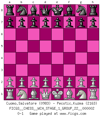 Last move : 0-1 2007 February 15 16:26:34 [Event "FICGS__CHESS__WCH_STAGE_1_GROUP_22__000002"] [Site "FICGS"] [Date "2007.01.16"] [Round "1"] [White "Cuomo,Salvatore"] [Black "Pecotic,Kuzma"] [Result "0-1"] [WhiteElo "0983"] [BlackElo "2163"] 0-1 This chess game has been lost on time (started : 2007.01.16 15:33:38) Player Black won this chess game. Follow this game move after move (download)The passed Pawn is a criminal, who should be kept under lock and key. Mild measures, such as police surveillance, are not sufficient. (Aaron Nimzovich) Rubinstein ist ein Turmendspiel, welches die Götter vor tausenden von Jahren begannen. (Savielly Grigorievitsch Tartakower) No hay un Gran Maestro de Ajedrez que sea normal; solo se diferencían ellos por la magnitud de su locura. (Viktor Korchnoi) Le joueur d'Echecs qui veut atteindre le top est obligé de développer son propre credo créatif. Alexeï Stepanovicth Souétine. Il est facile d'écrire des livres ! Ce qui est difficile, c'est de jouer ! (Alexeï Stepanovicth Souétine) All war is based on deception. (Sun Tzu)