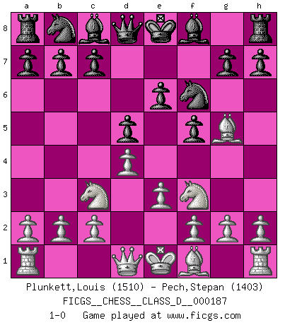 Last move : 1-0 2012 November 5 19:46:57 [Event "FICGS__CHESS__CLASS_D__000187"] [Site "FICGS"] [Date "2012.09.23"] [Round "1"] [White "Plunkett,Louis"] [Black "Pech,Stepan"] [Result "1-0"] [WhiteElo "1510"] [BlackElo "1403"] 1.d4 f5 2.Nc3 Nf6 3.Bg5 d5 4.Nf3 e6 5.e3 1-0 This chess game has been lost on time (started : 2012.09.23 0:48:21) Dutch Player White won this chess game. Follow this game move after move (download)Chess is a part of culture and if a culture is declining then Chess too will decline. (Mikhail Botvinnik) Ihnen, Herr Lasker, habe ich nur drei Worte zu sagen: Schach und matt. (Siegbert Tarrasch) El Ajedrez es un regaderazo frío para la mente. (Sir John Simon) J'apprécie les joueurs d'est-indienne, c'est grâce à eux que je nourris ma famille depuis tant d'années. (Petrosian) Never was anything great achieved without danger. (Niccolo Machiavelli)
