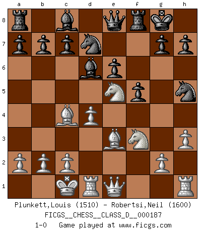 Last move : 1-0 2012 December 2 23:28:21 [Event "FICGS__CHESS__CLASS_D__000187"] [Site "FICGS"] [Date "2012.09.23"] [Round "1"] [White "Plunkett,Louis"] [Black "Robertsi,Neil"] [Result "1-0"] [WhiteElo "1510"] [BlackElo "1600"] 1.d4 e6 2.e4 d5 3.Be3 dxe4 4.Nd2 f5 5.f3 exf3 6.Ngxf3 Nf6 7.Qe2 Be7 8.O-O-O O-O 9.h3 Nh5 10.Qe1 Bd6 11.Ne5 Nd7 12.Ndf3 Qe8 13.Bc4 1-0 Queen's pawn Queenside Castling by player White (move 8) Kingside Castling by player Black (move 8) Player White won this chess game. Follow this game move after move (download)Suddenly it was obvious to me in my analysis I had missed what Fischer had found with the greatest of ease at the board. (Mikhail Botvinnik) Matt entspricht nicht immer den Tatsachen. (Savielly Grigorievitsch Tartakower) Cada Peón es potencialmente una Reina. (James Mason) Les pièces de l'échiquier étaient impitoyables. Elles le retenaient, elles l'absorbaient. Il y avait de l'horreur en cela, mais aussi une harmonie unique. Car, qu'y a-t-il dans le monde, à part les échecs ? (V. Nabokov) The quality of decision is like the well-timed swoop of a falcon which enables it to strike and destroy its victim. (Sun Tzu)