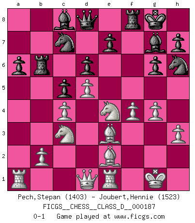 Last move : 0-1 2013 January 11 12:12:11 [Event "FICGS__CHESS__CLASS_D__000187"] [Site "FICGS"] [Date "2012.09.23"] [Round "1"] [White "Pech,Stepan"] [Black "Joubert,Hennie"] [Result "0-1"] [WhiteElo "1403"] [BlackElo "1523"] 1.c4 Nf6 2.Nc3 g6 3.Nf3 Bg7 4.d4 O-O 5.e4 d6 6.Be2 Nbd7 7.O-O c5 8.d5 a6 9.h3 Rb8 10.Re1 Ne8 11.Be3 Nc7 12.a4 Ne5 13.Nd2 f5 14.f4 Nf7 15.a5 fxe4 16.Ndxe4 Nh6 17.g4 b5 18.axb6 Rxb6 0-1 This chess game has been lost on time (started : 2012.09.23 0:48:21) English Opening Kingside Castling by player Black (move 4) Kingside Castling by player White (move 7) Player Black won this chess game. Follow this game move after move (download)Whoever sees no other aim in the game than that of giving checkmate to one's opponent will never become a good Chess player. (Euwe) Korrekt heißt in Deutschland die Haltung eines Mannes, dessen Benehmen nach dem Urteile seiner Nachbarn seiner Stellung angemessen ist. Um korrekt zu sein, muß man sich der Meinung der anderen anpassen... (Emanuel Lasker) El Ajedrez detiene a su maestro dentro de sus propios vínculos, encadenando la mente y el cerebro, por lo que la libertad interior del mas fuerte debe sufrir. (Albert Einstein) Le moment que je préfère le plus dans une rencontre, c'est celui où je sens que la personnalité de l'adversaire se brise. (Robert Fischer) A government big enough to give you everything you want is strong enough to take everything you have. (Thomas Jefferson)