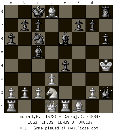 Last move : 0-1 2012 December 17 10:41:13 [Event "FICGS__CHESS__CLASS_D__000187"] [Site "FICGS"] [Date "2012.09.23"] [Round "1"] [White "Joubert,Hennie"] [Black "Czekaj,Christophe"] [Result "0-1"] [WhiteElo "1523"] [BlackElo "1584"] 1.e4 e6 2.e5 d6 3.exd6 Bxd6 4.Nf3 e5 5.d3 Nc6 6.Be2 Bg4 7.O-O Nf6 8.Bg5 h6 9.Bh4 Be6 10.Nc3 a6 11.Re1 Qd7 12.Bf1 O-O-O 13.Ne4 Nxe4 14.Bxd8 Nxf2 15.Kxf2 Bc5+ 16.Kg3 Qd6 17.Nd2 e4 18.Kh4 Qxh2+ 0-1 French : Steinitz attack Kingside Castling by player White (move 7) Queenside Castling by player Black (move 12) Player Black won this chess game. Follow this game move after move (download)We must make sure that Chess will not be like a dead language, very interesting, but for a very small group. (Sytze Faber) Schach ist mein Leben, meine Leidenschaft, was ich gelernt habe und seit meinem 14. Lebensjahr profimässig praktiziere. Darauf zu verzichten, würde mir sehr schwer fallen. (Viktor Kortschnoi) Cuando tu no sabes absolutamente que mas hacer, es tiempo de entrar en pánico. (John van der Wiel) Les échecs c'est le défi de l'alpiniste, toujours plus haut, prêt à tout pour monter à l'assaut du Roi ennemi. Les échecs, c'est de la musique en mouvement, un ballet majestueux pour les yeux. C'est de la poésie composée par les fantômes du passé qui au même titre que Rimbaud ou Verlaine méritent notre admiration. Les échecs, c'est de la peinture ou le moindre mouvement modifie le tableau pour en faire un Picasso ou un Van Gogh. Les échecs, c'est tout et rien, c'est la vie et la mort. Jjulie33 sur le forum de France-Echecs. Vladimir Ras-Putin is still alive... He is also a good actor, I saw him in the Lord of the Rings. (Rodolfo d'Ettorre)