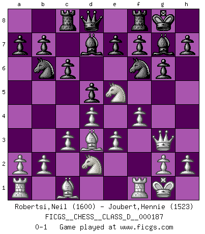 Last move : 0-1 2012 December 27 23:12:13 [Event "FICGS__CHESS__CLASS_D__000187"] [Site "FICGS"] [Date "2012.09.23"] [Round "1"] [White "Robertsi,Neil"] [Black "Joubert,Hennie"] [Result "0-1"] [WhiteElo "1600"] [BlackElo "1523"] 1.d4 Nf6 2.e3 g6 3.Bd3 Bg7 4.Nd2 O-O 5.c3 d5 6.f4 Bg4 7.Ngf3 Nbd7 8.O-O c6 9.Qe1 Rc8 10.Ne5 Nb6 11.Qg3 Bd7 0-1 This chess game has been lost on time (started : 2012.09.23 0:48:21) Queen's pawn game Kingside Castling by player Black (move 4) Kingside Castling by player White (move 8) Player Black won this chess game. Follow this game move after move (download)A bad plan is better than none at all. (Frank Marshall) Sie führen leise Selbstgespräche, schlürfen lautstark ihre Getränke, schmatzen hörbar beim Essen, blasen ihrem Gegenüber Rauch in die Augen, niesen ihm ins Gesicht, starren ihn unverwandt an, bis er sich unter ihren Blicken windet, rutschen ständig auf ihrem Stuhl hin und her, rülpsen und bohren in der Nase. (Anonymous) Dios mío, Bobby Fischer juega tan simple. (Alexei Suetin) Les Echecs sont affaire de jugement sensible. Savoir quand frapper et quand esquiver. (Fischer) Somehow our devils are never quite what we expect when we meet them face to face. (Nelson DeMille)