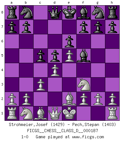 Last move : 1-0 2012 November 14 10:38:15 [Event "FICGS__CHESS__CLASS_D__000187"] [Site "FICGS"] [Date "2012.09.23"] [Round "1"] [White "Strohmeier,Josef"] [Black "Pech,Stepan"] [Result "1-0"] [WhiteElo "1429"] [BlackElo "1403"] 1.e4 c6 2.d4 d5 3.e5 Bf5 4.Nf3 e6 5.Be2 c5 6.c3 1-0 This chess game has been lost on time (started : 2012.09.23 0:48:21) Caro-Kann : Advance variation Player White won this chess game. Follow this game move after move (download)Chess is the art of analysis. (Mikhail Botvinnik) Sitze auf Deine Hände. (Siegbert Tarrasch) No hay precio que no valga la pena por la cabellera del Rey enemigo. (Koblentz) La tactique, c'est ce que vous faites quand il y a quelque chose à faire; la stratégie, c'est ce que vous faites quand il n'y a rien à faire. (Savielli Tartacower) At last I discovered the true beauty of chess. So I proposed to her. (Dinesh De Silva)