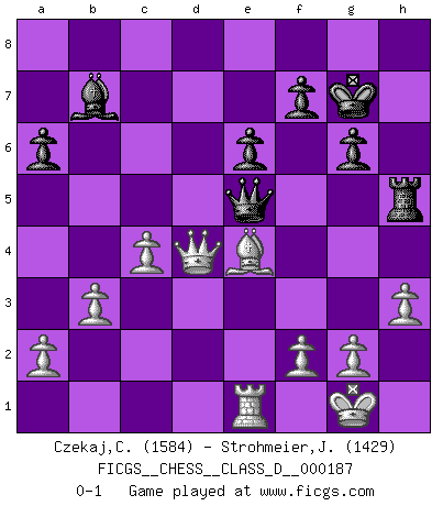Last move : 0-1 2013 April 19 9:5:51 [Event "FICGS__CHESS__CLASS_D__000187"] [Site "FICGS"] [Date "2012.09.23"] [Round "1"] [White "Czekaj,Christophe"] [Black "Strohmeier,Josef"] [Result "0-1"] [WhiteElo "1584"] [BlackElo "1429"] 1.Nc3 d5 2.d4 Nf6 3.Bg5 e6 4.e4 dxe4 5.Nxe4 Be7 6.Bxf6 Bxf6 7.Nf3 O-O 8.Bd3 Be7 9.Qe2 b6 10.O-O Bb7 11.Rad1 Nd7 12.c4 c5 13.dxc5 bxc5 14.Nc3 a6 15.Ne5 Bc8 16.Qe4 g6 17.Nxg6 hxg6 18.Qxa8 Qc7 19.Qf3 Kg7 20.h3 Nf6 21.Rfe1 Bb7 22.Qe2 Rh8 23.Ne4 Rh5 24.Nxf6 Bxf6 25.b3 Qf4 26.Qe3 Qc7 27.Be4 Bd4 28.Rxd4 cxd4 29.Qxd4+ Qe5 0-1 This chess game has been lost on time (started : 2012.09.23 0:48:21) Dunst (Sleipner, Heinrichsen) Opening Kingside Castling by player Black (move 7) Kingside Castling by player White (move 10) Player Black won this chess game. Follow this game move after move (download)You must take your opponent into a deep dark forest where 2+2=5, and the path leading out is only wide enough for one. (Mikhail Tal) Wer nie einen Fehler gemacht hat, hat nie etwas Neues ausprobiert. (Albert Einstein) Un jugador que trata de regresar una movida en el Ajedrez es un futuro carterista. (Richard Fenton) Il n'y a pas de prix trop élevé au scalp de l'ennemi. (Koblentz) All art requires courage. (Anne Tucker)