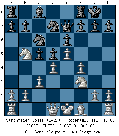 Last move : 1-0 2012 November 15 22:51:25 [Event "FICGS__CHESS__CLASS_D__000187"] [Site "FICGS"] [Date "2012.09.23"] [Round "1"] [White "Strohmeier,Josef"] [Black "Robertsi,Neil"] [Result "1-0"] [WhiteElo "1429"] [BlackElo "1600"] 1.e4 e6 2.d4 d5 3.Nc3 Nf6 4.Bg5 Be7 5.e5 Nfd7 6.Bxe7 Qxe7 7.f4 c5 8.Nf3 Nc6 9.Nb5 O-O 10.c3 1-0 This chess game has been lost on time (started : 2012.09.23 0:48:21) French : Classical, Steinitz variation Kingside Castling by player Black (move 9) Player White won this chess game. Follow this game move after move (download)Via the squares on the chessboard, the Indians explain the movement of time and the age, the higher influences which control the world and the ties which link Chess with the human soul. (Al-Masudi) Ich hatte Zahnschmerzen im ersten Spiel. In der zweiten Partie tat mir der Kopf weh. In der dritten war es eine Rheuma-Attacke und während der vierten fühlte ich mich nicht gut. Und in der fünften? Nun, man muss doch nicht jedes Spiel gewinnen, oder? (Savielly Grigorievitsch Tartakower) No hay precio que sea tan grande por la cabellera del Rey enemigo. (Koblentz) Ce qui caractérise les parties de combat, c'est que si le défenseur a constamment de difficiles problèmes à résoudre, l'attaquant doit chercher sans relâche de nouvelles possibilités d'attaque. (Koblentz) Gambling is the son of avarice and the father of despair. (French proverb)