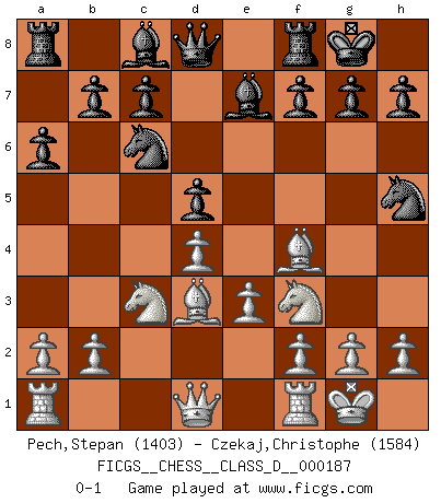 Last move : 0-1 2012 December 4 11:28:28 [Event "FICGS__CHESS__CLASS_D__000187"] [Site "FICGS"] [Date "2012.09.23"] [Round "1"] [White "Pech,Stepan"] [Black "Czekaj,Christophe"] [Result "0-1"] [WhiteElo "1403"] [BlackElo "1584"] 1.d4 Nf6 2.c4 e6 3.Nf3 d5 4.Nc3 Be7 5.Bf4 O-O 6.e3 a6 7.cxd5 exd5 8.Bd3 Nc6 9.O-O Nh5 0-1 This chess game has been lost on time (started : 2012.09.23 0:48:21) Queen's pawn game Kingside Castling by player Black (move 5) Kingside Castling by player White (move 9) Player Black won this chess game. Follow this game move after move (download)A Chess game is a dialogue, a conversation between a player and his opponent. Each move by the opponent may contain threats or be a blunder, but a player cannot defend against threats or take advantage of blunders if he does not first ask himself: What is my opponent planning after each move ? (Bruce A. Moon) Wenn Spassky eine Figur opfert kannst du genauso gut aufgeben. Aber wenn Tal eine Figur opfert, spiel weiter. Er könnte noch eine weitere opfern, und dann ... wer weiß? (Miguel Najdorf) Todavía soy una víctima del Ajedrez. Tiene toda la belleza del arte y mucho mas. No puede ser comercializado. El Ajedrez es mas puro que el arte en su posición social. (Marcel Duchamp) Les Cavaliers se révèlent fort utiles dans les positions fermées. D'habitude, les Fous sont un peu plus forts que les Cavaliers dans les positions ouvertes. Qu'on le veuille ou non, il restera toujours des exceptions ! You lose, general Kenobi. (General Grievous in Star Wars ep.3)