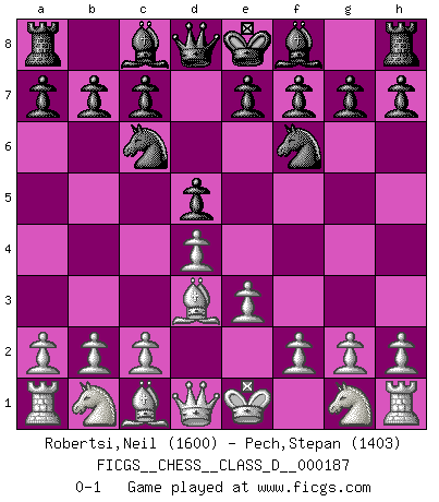 Last move : 0-1 2012 December 17 10:30:54 [Event "FICGS__CHESS__CLASS_D__000187"] [Site "FICGS"] [Date "2012.09.23"] [Round "1"] [White "Robertsi,Neil"] [Black "Pech,Stepan"] [Result "0-1"] [WhiteElo "1600"] [BlackElo "1403"] 1.d4 Nf6 2.e3 d5 3.Bd3 Nc6 0-1 This chess game has been lost on time (started : 2012.09.23 0:48:21) Queen's pawn game Player Black won this chess game. Follow this game move after move (download)In order to improve your game, you must study the endgame before everything else, for whereas the endings can be studied and mastered by themselves, the middle game and the opening must be studied in relation to the endgame. (Jose Raul Capablanca) Wenn es im Universum noch irgendwo intelligente Lebewesen gibt, dann kennen sie Go. (Emanuel Lasker) Personalmente, yo prefiero mirar hacia el futuro en donde un programa de computadora gane el título mundial de Ajedrez. La humanidad necesita una lección de humildad. (Richard Dawkings) Je ne crois pas en la psychologie, je crois aux bons coups. (Robert Fischer) Life doesn't imitate art, it imitates bad television. (Woody Allen)