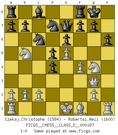 Last move : 1-0 2012 December 16 22:30:6 [Event "FICGS__CHESS__CLASS_D__000187"] [Site "FICGS"] [Date "2012.09.23"] [Round "1"] [White "Czekaj,Christophe"] [Black "Robertsi,Neil"] [Result "1-0"] [WhiteElo "1584"] [BlackElo "1600"] 1.Nc3 d5 2.d4 e6 3.e4 Nf6 4.Bg5 Be7 5.e5 Nfd7 6.h4 Bxg5 7.hxg5 Qxg5 8.Qd3 h6 9.Nh3 Qe7 10.Qg3 O-O 11.f4 c5 12.Nb5 Nc6 13.Nf2 cxd4 14.Ng4 1-0 Dunst (Sleipner, Heinrichsen) Opening Kingside Castling by player Black (move 10) Player White won this chess game. Follow this game move after move (download)The older I grow, the more I value pawns. (Paul Keres) Um dein Spiel zu verbessern musst du zuallererst das Endspiel studieren, denn diese kann unabhängig studiert werden. Die Eröffnung und das Mittelspiel müssen immer in Bezug gesetzt werden zum Endspiel. (José Raúl Capablanca) El Ajedrez, como la música, como el amor, tiene el poder de hacer feliz a la gente. (Siegbert Tarrasch) Botvinnik disait en comparant les échecs à la musique: Il existe une science dont le but est l'étude de l'acoustique et des sons. Mais il y a aussi un art qui se sert de l'océan des sons : c'est la musique. De toute évidence, il en est de même pour la pensée. La logique est l'étude des lois de la réflexion et les échecs reflètent, en tant qu'art, le côté logique de la réflexion, sous la forme d'images artistiques... Extrait de Fischer - Spassky, Reykjavik 1972 par Alexander & F. Wyndham (Ed. Solar), p 37. Whenever people agree with me, I always feel I must be wrong. (Oscar Wilde)