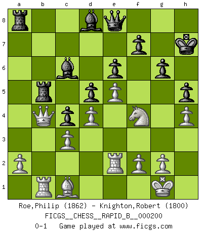 Last move : 0-1 2013 January 3 23:39:58 [Event "FICGS__CHESS__RAPID_B__000200"] [Site "FICGS"] [Date "2012.09.23"] [Round "1"] [White "Roe,Philip"] [Black "Knighton,Robert"] [Result "0-1"] [WhiteElo "1862"] [BlackElo "1800"] 1.e4 b6 2.d4 Bb7 3.Nc3 Nf6 4.Bd3 e6 5.Nge2 d5 6.e5 Ne4 7.Nf4 Nxc3 8.bxc3 c5 9.Ba3 g6 10.O-O Nc6 11.Bb5 a6 12.Bxc6+ Bxc6 13.Qd2 Bb5 14.Rfe1 Rc8 15.Re3 h5 16.Bc1 Ba4 17.Qd3 Qd7 18.Qxa6 Be7 19.Qxb6 O-O 20.Rb1 Bxc2 21.Rb2 Bf5 22.Bd2 c4 23.Re1 Ra8 24.Ra1 Ba3 25.Rb5 Rfc8 26.Ra5 Rab8 27.Qa6 Be7 28.h3 Qd8 29.Rb5 Ra8 30.Qb7 Bc2 31.Rb2 Ba4 32.Rab1 Bc6 33.Qb6 Qe8 34.Bc1 Bd8 35.Qb4 Ra4 36.Qc5 Ra5 37.Qb4 Rca8 38.h4 Kh7 39.Re2 Rb5 0-1 Owen defense Kingside Castling by player White (move 10) Kingside Castling by player Black (move 19) Player Black won this chess game. Follow this game move after move (download)The isolated Pawn casts gloom over the entire chessboard. (Aaron Nimzovich) Spielt Blackmar-Diemer-Gambit, und das Matt kommt von selbst! (Emil Joseph Diemer) El jugador blanco perdió porque fallo en recordar la coreccta continuación y tuvo que pensar por sí mismo las movidas. (Siegbert Tarrasch) Horreur, mais aussi harmonie suprême : qu'y avait-il en effet au monde en dehors des échecs ? Le brouillard, l'inconnu, le non-être... (Vladimir Nabokov) War is the child of passion, passion is the child of narcissism and narcissism is the child. (...) Another game ? (Thibault de Vassal)