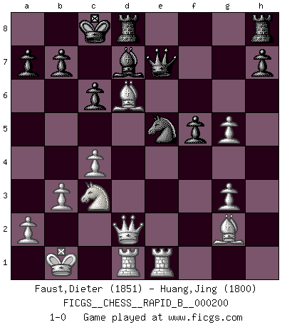 Last move : 1-0 2012 December 26 23:8:59 [Event "FICGS__CHESS__RAPID_B__000200"] [Site "FICGS"] [Date "2012.09.23"] [Round "1"] [White "Faust,Dieter"] [Black "Huang,Jing"] [Result "1-0"] [WhiteElo "1851"] [BlackElo "1800"] 1.c4 e5 2.g3 d6 3.Bg2 f5 4.Nc3 Nf6 5.b3 g6 6.Bb2 Bg7 7.Nf3 Nbd7 8.d3 Ng4 9.h3 Nh6 10.Qd2 Nf7 11.h4 Nf6 12.O-O-O Bd7 13.Ng5 Bc8 14.e4 Bh6 15.exf5 gxf5 16.f4 c6 17.Kb1 Qe7 18.Ba3 Bd7 19.Rhe1 Ng4 20.fxe5 Ngxe5 21.d4 O-O-O 22.dxe5 Nxe5 23.Bxd6 Bxg5 24.hxg5 1-0 This chess game has been lost on time (started : 2012.09.23 0:49:58) English Opening Queenside Castling by player White (move 12) Queenside Castling by player Black (move 21) Player White won this chess game. Follow this game move after move (download)Fischer Chess play was always razor-sharp, rational and brilliant. One of the best ever. (Dave Regis) Mit Schach schule ich mein Gefühl für Geometrie, was für Tennis und Schach gleichermaßen wichtig ist. (Boris Becker) Vive, pierde y aprende al observar a tu oponente como ganar. (Amber Steenbock) L'attaque fait le spectacle, la défense gagne les matchs. (Dicton footballistique) There are more things in heaven and earth than practically anywhere else. (Unknown)