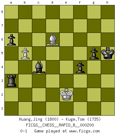 Last move : 0-1 2012 December 6 7:33:3 [Event "FICGS__CHESS__RAPID_B__000200"] [Site "FICGS"] [Date "2012.09.23"] [Round "1"] [White "Huang,Jing"] [Black "Kuge,Tom"] [Result "0-1"] [WhiteElo "1800"] [BlackElo "1735"] 1.e4 e5 2.Nf3 Nf6 3.Nxe5 d6 4.Nf3 Nxe4 5.d4 d5 6.Bd3 Nc6 7.O-O Bg4 8.c4 Nf6 9.Nc3 Nxd4 10.Qe1+ Ne6 11.Ne5 Bh5 12.f3 Bc5+ 13.Kh1 O-O 14.cxd5 Nxd5 15.Qe4 Nf6 16.Qxb7 Qd4 17.f4 Ng4 18.Qf3 Nf2+ 19.Qxf2 Qxf2 20.Rxf2 Bxf2 21.Bd2 Rfd8 22.Ne4 Bd4 23.Rb1 Bxe5 24.fxe5 Rxd3 25.Bc3 Rad8 26.Nf2 R3d5 27.h3 h6 28.Kh2 Nc5 29.b3 Nd3 30.Nxd3 Rxd3 31.Ba5 Rd1 32.Rb2 Bg6 33.Bxc7 Rc8 34.Bd6 Rc2 35.Rxc2 Bxc2 36.Bc5 a6 37.b4 Ra1 38.Bd6 Rxa2 39.Kg3 Be4 40.Kf4 Bxg2 41.h4 Bd5 42.Kg3 f5 43.Be7 Kf7 44.Bd6 g5 45.hxg5 hxg5 46.Bc7 Ra3+ 47.Kf2 Kg6 48.Bd6 Kh5 49.Ke2 f4 50.e6 Bxe6 51.b5 Bc4+ 0-1 Petrov : Classical attack Kingside Castling by player White (move 7) Kingside Castling by player Black (move 13) 10 pieces endgame at move 45 : White KBPP , Black KRBPPP WHITE : King + 1 Bishop 2 Pawns BLACK : King + 1 Rook 1 Bishop 3 Pawns 9 pieces endgame at move 50 : White KBP , Black KRBPPP WHITE : King + 1 Bishop 1 Pawn BLACK : King + 1 Rook 1 Bishop 3 Pawns Player Black won this chess game. Follow this game move after move (download)The essence of Chess is thinking about what Chess is. (David Bronstein) Obendrein hat der FIDE-Präsident den Revolutionsführer Gaddafi zum »Großmeister« ernannt, am Ende der WM. Das ist lächerlich! (Joel Lautier) Dios mío, Bobby Fischer juega tan simple. (Alexei Suetin) Avant la finale, les dieux ont créé le milieu de partie. (Tarrasch) Fear is the path to the dark side. Fear leads to anger; anger leads to hate; hate leads to suffering. I sense much fear in you. (Master Yoda in Star Wars ep.1)