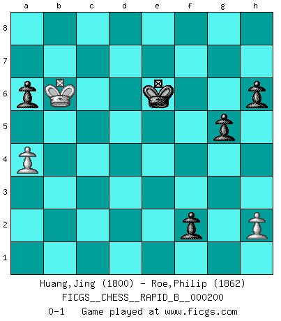 Last move : 0-1 2012 December 8 3:1:33 [Event "FICGS__CHESS__RAPID_B__000200"] [Site "FICGS"] [Date "2012.09.23"] [Round "1"] [White "Huang,Jing"] [Black "Roe,Philip"] [Result "0-1"] [WhiteElo "1800"] [BlackElo "1862"] 1.e4 c5 2.Nf3 e6 3.d4 cxd4 4.Nxd4 Nf6 5.Nc3 d6 6.g4 h6 7.f4 e5 8.Ndb5 Bxg4 9.Be2 Bxe2 10.Qxe2 a6 11.Na3 b5 12.Nd5 Nxd5 13.exd5 Qh4+ 14.Qf2 Be7 15.Be3 Nd7 16.Rf1 Qxf2+ 17.Kxf2 Rc8 18.Rac1 O-O 19.Ke2 exf4 20.Bxf4 Rc5 21.c4 bxc4 22.Nxc4 Re8 23.Kd3 Rxd5+ 24.Kc2 Ne5 25.Ne3 Rc5+ 26.Kb1 Rxc1+ 27.Rxc1 Nd3 28.Rc4 Nxf4 29.Rxf4 Bg5 30.Rd4 Rxe3 31.Rxd6 Re1+ 32.Kc2 Re2+ 33.Kb1 Bf6 34.Rb6 Rxb2+ 35.Rxb2 Bxb2 36.Kxb2 f5 37.Kc3 g5 38.Kd3 Kf7 39.Kd4 Ke6 40.Kc5 f4 41.Kb6 f3 42.a4 f2 0-1 Sicilian : Anderssen variation Kingside Castling by player Black (move 18) 10 pieces endgame at move 35 : White KRPP , Black KBPPPP WHITE : King + 1 Rook 2 Pawns BLACK : King + 1 Bishop 4 Pawns 9 pieces endgame at move 35 : White KPP , Black KBPPPP WHITE : King + 2 Pawns BLACK : King + 1 Bishop 4 Pawns 8 pieces endgame at move 36 : White KPP , Black KPPPP WHITE : King + 2 Pawns BLACK : King + 4 Pawns Player Black won this chess game. Follow this game move after move (download)Weak points or holes in the opponent's position must be occupied by pieces not Pawns. (Siegbert Tarrasch) Zum Sieg gelangt man nicht, wenn man gut, sondern nur wenn man besser spielt (Savielly Grigorievitsch Tartakower) Un jugador que trata de regresar una movida en el Ajedrez es un futuro carterista. (Richard Fenton) Le thème de l'attaque double intervient d'une manière ou d'une autre dans l'immense majorité des combinaisons. (Youri Averbakh) When you stop learning you start dying. (M. Scott Adams)