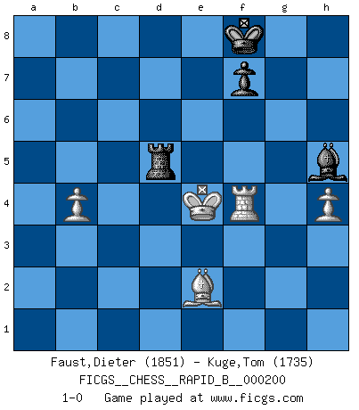 Last move : 1-0 2012 November 30 20:1:41 [Event "FICGS__CHESS__RAPID_B__000200"] [Site "FICGS"] [Date "2012.09.23"] [Round "1"] [White "Faust,Dieter"] [Black "Kuge,Tom"] [Result "1-0"] [WhiteElo "1851"] [BlackElo "1735"] 1.e4 e5 2.f4 exf4 3.Nf3 d5 4.exd5 Bd6 5.d4 c6 6.dxc6 Nxc6 7.d5 Nce7 8.Bb5+ Kf8 9.Nc3 Bg4 10.O-O Nf6 11.Qd3 h6 12.Nd4 Nexd5 13.Nxd5 Nxd5 14.h3 Bh5 15.Nf5 Bc5+ 16.Kh1 g6 17.Bc4 Nf6 18.Bxf4 Qxd3 19.cxd3 gxf5 20.Be5 Be7 21.Rxf5 Bg6 22.Rf3 Rg8 23.Bxf6 Bxf6 24.Rxf6 Kg7 25.Raf1 Rgf8 26.a4 Rac8 27.Kg1 Rc7 28.R1f3 Re8 29.Kf2 Re5 30.b3 a6 31.d4 Rg5 32.h4 Ra5 33.d5 b5 34.d6 Rd7 35.axb5 axb5 36.b4 Ra3 37.Bxb5 Rxf3+ 38.Kxf3 Rd8 39.Rf4 Rxd6 40.Ke3 Rd1 41.Bc4 Kf8 42.g4 h5 43.Be2 Rd5 44.gxh5 Bxh5 45.Ke4 1-0 KGA : Abbazia defense (Classical defense, Modern defense!) Kingside Castling by player White (move 10) 10 pieces endgame at move 44 : White KRBPPP , Black KRBP WHITE : King + 1 Rook 1 Bishop 3 Pawns BLACK : King + 1 Rook 1 Bishop 1 Pawn 9 pieces endgame at move 44 : White KRBPP , Black KRBP WHITE : King + 1 Rook 1 Bishop 2 Pawns BLACK : King + 1 Rook 1 Bishop 1 Pawn Player White won this chess game. Follow this game move after move (download)A good player is always lucky. (Jose Raul Capablanca) Ein Schachgenie ist jemand der verdammt gut Schach spielt. (Jonathan Levitt) Ayuda a tus piezas para que ellas te puedan ayudar. (Paul Morphy) Les échecs sont un jeu par leur forme, un art par leur essence et une science par sa difficulté d'acquisition. Ils peuvent vous procurer autant de plaisir qu'un bon livre ou une belle musique, mais vous n'aurez une réelle joie que si vous arrivez à bien jouer. (Tigran Petrosian) The difference between perseverance and obstinacy is that one comes from a strong will, and the other from a strong won't. (Henry Ward Beecher)