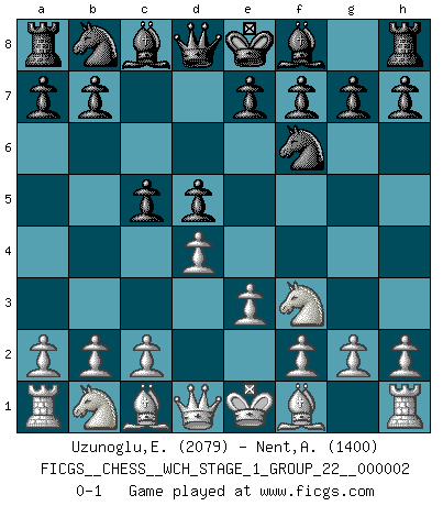 Last move : 0-1 2007 March 15 13:56:24 [Event "FICGS__CHESS__WCH_STAGE_1_GROUP_22__000002"] [Site "FICGS"] [Date "2007.01.16"] [Round "1"] [White "Uzunoglu,Efe Kerem"] [Black "Nent,Alexander"] [Result "0-1"] [WhiteElo "2079"] [BlackElo "1400"] 1.d4 Nf6 2.Nf3 d5 3.e3 c5 0-1 This chess game has been lost on time (started : 2007.01.16 15:33:38) Queen's pawn game Player Black won this chess game. Follow this game move after move (download)I'm not a materialistic person, in that, I don't suffer the lack or loss of money. The absence of worldly goods I don't look back on. For Chess is a way I can be as materialistic as I want without having to sell my soul. (Jamie Walter Adams) Im Wettkampf zwischen starken Meistern kommen Fehler sehr selten vor, deshalb ist es mit bloßem Warten nicht getan. (José Raúl Capablanca) Un sacrificio se refuta mucho mejor al aceptarlo. (Wilhelm Steinitz) Demandez au pauvre Cg1 ce qu'il en pense. Eduard Gufeld à propos de la variante Saemisch de l'Est-Indienne. Life is like a game of cards: the hand you are dealt represents determinism; the way you play it is free will. (Jawaharlal Nehru)