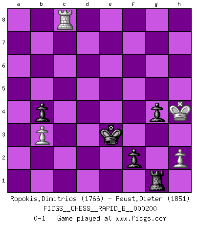 Last move : 0-1 2013 March 2 13:38:50 [Event "FICGS__CHESS__RAPID_B__000200"] [Site "FICGS"] [Date "2012.09.23"] [Round "1"] [White "Ropokis,Dimitrios"] [Black "Faust,Dieter"] [Result "0-1"] [WhiteElo "1766"] [BlackElo "1851"] 1.e4 c5 2.Nc3 d6 3.f4 Nc6 4.Nf3 g6 5.Bb5 Bd7 6.O-O Bg7 7.Bxc6 Bxc6 8.Qe1 Nf6 9.d3 O-O 10.Bd2 Qb6 11.Rb1 c4 12.Kh1 cxd3 13.cxd3 Qa6 14.Qe2 Rac8 15.Be3 Ng4 16.Bg1 b6 17.Nd4 Bd7 18.Nd5 Rfe8 19.Rbc1 Qb7 20.f5 Nf6 21.Nc3 b5 22.a3 Rc7 23.Nb3 e6 24.fxg6 hxg6 25.Na5 Qc8 26.Be3 Qa6 27.Nb3 Rec8 28.Qf3 Be8 29.d4 Qb7 30.Bd2 Qb6 31.Bg5 Nd7 32.Bd2 a5 33.Ne2 Rxc1 34.Nbxc1 f5 35.exf5 exf5 36.Nf4 Qxd4 37.Ncd3 Ne5 38.Qb7 Bd7 39.Bc3 Qc4 40.Bxe5 dxe5 41.Qxd7 exf4 42.Re1 f3 43.gxf3 Qc6 44.Re8+ Kh7 45.Qxc6 Rxc6 46.Re2 Rd6 47.Nc5 Rd1+ 48.Kg2 Bd4 49.Ne6 Rg1+ 50.Kh3 Bf6 51.Nf8+ Kh6 52.Nd7 Bg7 53.f4 Rg4 54.Nc5 Rxf4 55.Ne6 Rf3+ 56.Kg2 Rb3 57.Nxg7 Kxg7 58.Rf2 Kf6 59.Rc2 g5 60.Rc6+ Ke5 61.Rc5+ Ke4 62.Rc2 g4 63.Re2+ Re3 64.Rc2 f4 65.Kf2 Kd3 66.Rc3+ Kd2 67.Rc7 Re2+ 68.Kg1 b4 69.axb4 axb4 70.b3 Ke3 71.Rc8 Re1+ 72.Kg2 f3+ 73.Kg3 Rg1+ 74.Kh4 f2 0-1 Sicilian : Closed Kingside Castling by player White (move 6) Kingside Castling by player Black (move 9) 10 pieces endgame at move 69 : White KRPPP , Black KRPPP WHITE : King + 1 Rook 3 Pawns BLACK : King + 1 Rook 3 Pawns 9 pieces endgame at move 69 : White KRPP , Black KRPPP WHITE : King + 1 Rook 2 Pawns BLACK : King + 1 Rook 3 Pawns Player Black won this chess game. Follow this game move after move (download)Life is a kind of Chess, with struggle, competition, good and ill events. (Benjamin Franklin) Woher wissen wir, daß der Neanderthaler Blindschach gespielt hat? -- Bei Ausgrabungen wurden keine Schachbretter und Figuren gefunden. (Anonymous) No es una movida, aún la mejor movida que tu debas buscar, sino un plan comprensible. (Eugene Znosko-Borovsky) Ce qui caractérise les parties de combat, c'est que si le défenseur a constamment de difficiles problèmes à résoudre, l'attaquant doit chercher sans relâche de nouvelles possibilités d'attaque. (Koblentz) When a man with money meets a man with experience, the man with experience leaves with money and the man with money leaves with experience. (Anonymous)
