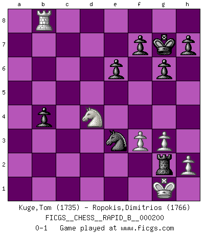 Last move : 0-1 2012 October 7 8:4:44 [Event "FICGS__CHESS__RAPID_B__000200"] [Site "FICGS"] [Date "2012.09.23"] [Round "1"] [White "Kuge,Tom"] [Black "Ropokis,Dimitrios"] [Result "0-1"] [WhiteElo "1735"] [BlackElo "1766"] 1.e4 c5 2.a3 g6 3.b4 d6 4.Bb2 Nf6 5.bxc5 Bg7 6.Bb5+ Bd7 7.Qe2 O-O 8.cxd6 Bxb5 9.Qxb5 Qxd6 10.e5 Qd5 11.Qxd5 Nxd5 12.Nf3 e6 13.O-O Nc6 14.d4 Na5 15.Nbd2 Rac8 16.Rac1 b5 17.c3 Bh6 18.Rc2 Rc6 19.Ne4 Rfc8 20.Nd6 Rb8 21.Ra1 Nc4 22.Nxc4 Rxc4 23.Kf1 Kg7 24.Ne1 Rbc8 25.Nd3 Rxd4 26.cxd4 Rxc2 27.Bc1 Bxc1 28.Rxc1 Rd2 29.Ne1 Rxd4 30.Rc5 a6 31.Nc2 Re4 32.Rc6 a5 33.f3 Rxe5 34.Kf2 b4 35.axb4 axb4 36.Nd4 Re3 37.Rc8 Ra3 38.Rb8 Ra2+ 39.Kg1 Ne3 40.g3 Rg2+ 0-1 Sicilian defense Kingside Castling by player Black (move 7) Kingside Castling by player White (move 13) Player Black won this chess game. Follow this game move after move (download)Chess is not like life... it has rules ! (Mark Pasternak) Mutter, ich bin eben Ex-Weltmeister geworden. --beim nach Hause Kommen nach dem Verlust des WM-Titels an Mihail Botvinnik -- (Mikhail Nekhemyevich Tal) El jugador táctico debe saber que hacer cuando algo se debe de hacer. El estratégico debe saber que hacer cuando nada se debe de hacer. (Savielly Tartakover) Il (Jacob Murray) ne joue pas pour le bon coup, mais pour le meilleur. (Eloi Relange) Man is reluctant to give credit for intelligence to anyone, except his enemies. (Albert Einstein)