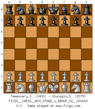 Last move : 0-1 2007 February 15 16:26:34 [Event "FICGS__CHESS__WCH_STAGE_1_GROUP_22__000002"] [Site "FICGS"] [Date "2007.01.16"] [Round "1"] [White "Temesvary,Sandor"] [Black "Uzunoglu,Efe Kerem"] [Result "0-1"] [WhiteElo "1400"] [BlackElo "2079"] 0-1 This chess game has been lost on time (started : 2007.01.16 15:33:38) Player Black won this chess game. Follow this game move after move (download)Fischer is an American Chess tragedy on par with Morphy and Pillsbury. (Mig Greengard) Du musst nicht gut spielen, es reicht, wenn du besser spielst als dein Gegner. (Anonymous) Una buena memoria, concentración, imaginación y una fuerte voluntad, se requiere para llegar a ser un buen jugador. (Bobby Fischer) RxDa4 pat (...) Wisdom is the reward you get for a lifetime of listening when you'd have preferred to talk. (Doug Larson)