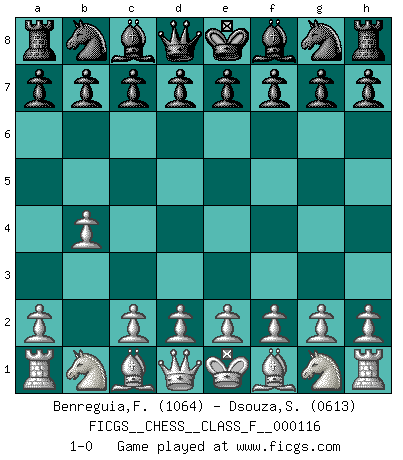 Last move : 1-0 2012 November 3 22:11:34 [Event "FICGS__CHESS__CLASS_F__000116"] [Site "FICGS"] [Date "2012.09.23"] [Round "1"] [White "Benreguia,Frederic"] [Black "Dsouza,Stanislaus"] [Result "1-0"] [WhiteElo "1064"] [BlackElo "0613"] 1.b4 1-0 This chess game has been lost on time (started : 2012.09.23 3:4:21) Polish (Sokolsky) opening Player White won this chess game. Follow this game move after move (download)It is not enough to be a good player... you must also play well. (Siegbert Tarrasch) Es ist schade, dass viele Schachsportler vergessen, wie wichtig Auftreten und angemessene Kleidung sind. (Alexandra Kosteniuk) Un mal día en el Ajedrez, es mejor que cualquier buen día en el trabajo. (Anonymous) D'abord les bases : Jouez et étudiez, puis étudiez et jouez, ensuite jouez et étudiez, puis étudiez et jouez. Deuxièmement : Donnez toujours le meilleur de vous-même ! (Ken Smith) Methinks King Thibault should dub Marius Zubac a knight of the square board... I mean table, henceforth addressing him as Sir Marius, and bestow on him a suitable land from the kingdom of FICGS & marry him off to a worthy, fair maiden, lest he slice our heads with his mighty sword in his wrath. (Dinesh De Silva)