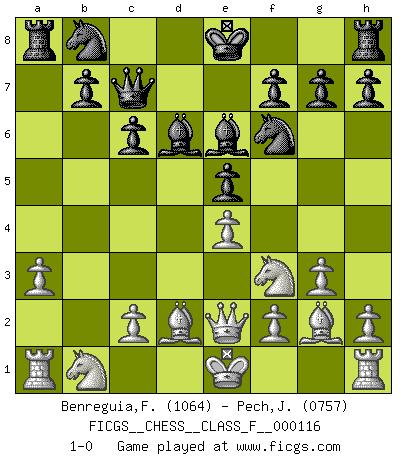 Last move : 1-0 2012 December 9 0:32:55 [Event "FICGS__CHESS__CLASS_F__000116"] [Site "FICGS"] [Date "2012.09.23"] [Round "1"] [White "Benreguia,Frederic"] [Black "Pech,Jaroslav"] [Result "1-0"] [WhiteElo "1064"] [BlackElo "0757"] 1.b4 e5 2.a3 d5 3.d3 Bd6 4.g3 Be6 5.Bg2 c6 6.e4 dxe4 7.dxe4 a5 8.bxa5 Qxa5+ 9.Bd2 Qc7 10.Nf3 Nf6 11.Qe2 1-0 Polish (Sokolsky) opening Player White won this chess game. Follow this game move after move (download)A man without frontiers. He didn't divide the East and the West, he brought them together in their admiration for him. (Ljubomir Ljubojevic, about Bobby Fischer's death) Ich organisiere ein großes Turnier, was mich etwa 120000 Dollar kostet. Ich denke, das ist das erste Mal in der Schachgeschichte, daß ein Schachgroßmeister auch als Mäzen auftritt. (Miguel Najdorf) El tablero es el mundo, las piezas es el fenomeno del universo, las reglas del juego son lo que llamamos leyes de la naturaleza y el jugador del lado opuesto, se encuentra oculto a nuestra vista. (Thomas Huxley) La tactique, c'est ce que vous faites quand il y a quelque chose à faire; la stratégie, c'est ce que vous faites quand il n'y a rien à faire. (Savielli Tartacower) I don't believe in psychology. I believe in good moves. (Bobby Fischer)