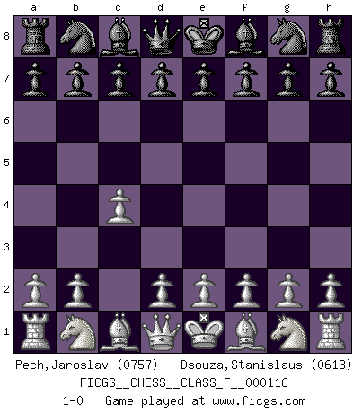 Last move : 1-0 2012 November 2 10:4:40 [Event "FICGS__CHESS__CLASS_F__000116"] [Site "FICGS"] [Date "2012.09.23"] [Round "1"] [White "Pech,Jaroslav"] [Black "Dsouza,Stanislaus"] [Result "1-0"] [WhiteElo "0757"] [BlackElo "0613"] 1.c4 1-0 This chess game has been lost on time (started : 2012.09.23 3:4:21) English Opening Player White won this chess game. Follow this game move after move (download)You may learn much more from a game you lose than from a game you win. You will have to lose hundreds of games before becoming a good player. (Jose Raul Capablanca) In der Schule lernt man nichts. Es ist nur Zeitverschwendung. (Robert James Fischer) Combinaciones deslumbrantes son para la mayoría, mover madera es para los pocos. (Georg Kieninger) On n'a jamais que l'âge auquel on a commence à jouer aux échecs car après on cesse de vieillir. (Capablanca) Looking at the proliferation of personal web pages on the Net, it looks like very soon everyone on Earth will have 15 megabytes of fame. (M.G. Sriram)