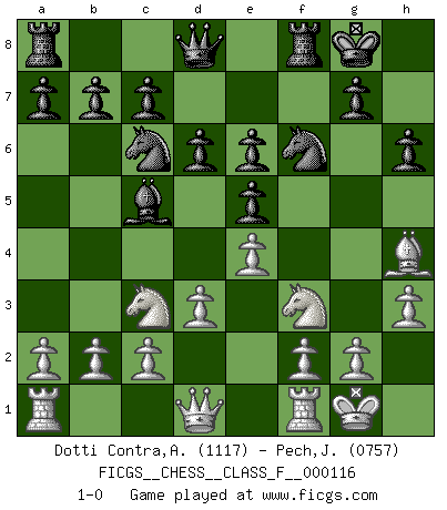 Last move : 1-0 2012 November 12 13:53:13 [Event "FICGS__CHESS__CLASS_F__000116"] [Site "FICGS"] [Date "2012.09.23"] [Round "1"] [White "Dotti Contra,Alessandro"] [Black "Pech,Jaroslav"] [Result "1-0"] [WhiteElo "1117"] [BlackElo "0757"] 1.e4 e5 2.Nf3 Nc6 3.Nc3 Nf6 4.Bc4 Bc5 5.h3 d6 6.d3 Be6 7.Bxe6 fxe6 8.O-O O-O 9.Bg5 h6 10.Bh4 1-0 Four knights : Italian variation Kingside Castling by player White (move 8) Kingside Castling by player Black (move 8) Player White won this chess game. Follow this game move after move (download)Later, I began to succeed in decisive games. Perhaps because I realized a very simple truth: not only was I worried, but also my opponent. (Mikhail Tal) Es liegt in der Natur, vernüftig zu denken und unlogisch zu handeln. (Anatole France) La mitad de las variaciones que son calculadas en una partida de torneo, resultan ser completamente superfluas. Desafortunadamente, nadie sabe por adelantado cual mitad. (Jan Tinman) Si rien de grave n'est détecté lors de l'analyse d'une position, on joue alors le coup. Seconde règle de Blumenfeld. Unless I accept my faults I will most certainly doubt my virtues. (Hugh Prather)