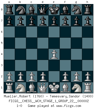 Last move : 1-0 2007 February 15 22:29:16 [Event "FICGS__CHESS__WCH_STAGE_1_GROUP_22__000002"] [Site "FICGS"] [Date "2007.01.16"] [Round "1"] [White "Mueller,Robert"] [Black "Temesvary,Sandor"] [Result "1-0"] [WhiteElo "1760"] [BlackElo "1400"] 1.e4 1-0 This chess game has been lost on time (started : 2007.01.16 15:33:38) King's pawn Opening Player White won this chess game. Follow this game move after move (download)It is always better to sacrifice your opponent's men. (Savielly Tartakower) Es war undenkbar für die Behörden, dass ein sowjetischer Großmeister auf diese Art und Weise [Fischer-Taimanov 6:0] verliert, ohne dass es eine politischer Erklärung dafür gäbe. (Mark Taimanov) Cualquier cambio de material en una posición debe venir por medio de un mate, una captura o promoción de Peón. (Purdy) Même un GMI sait rarement calculer sur plus de cinq coups une attaque à sacrifices. (Rudolf Spielmann) If you work for a living, why do you kill yourself working ? (Tuco to a chicken in The Good, The Bad and The Ugly)