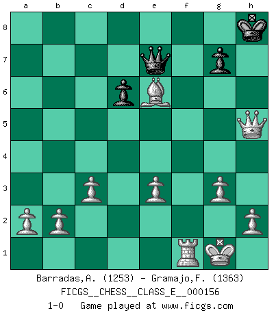 Last move : 1-0 2012 October 6 11:13:53 [Event "FICGS__CHESS__CLASS_E__000156"] [Site "FICGS"] [Date "2012.09.23"] [Round "1"] [White "Barradas,Anderson"] [Black "Gramajo,Francisco"] [Result "1-0"] [WhiteElo "1253"] [BlackElo "1363"] 1.e4 e5 2.Nf3 Nc6 3.d4 Bd6 4.dxe5 Nxe5 5.Nxe5 Bxe5 6.Nc3 Qf6 7.Nd5 Qc6 8.Be2 Nf6 9.Nxf6+ Qxf6 10.Bf3 h6 11.c3 d5 12.Qxd5 Be6 13.Qxb7 O-O 14.Qa6 Rfd8 15.Be3 Rd6 16.Qb7 R6d8 17.Rd1 Rxd1+ 18.Bxd1 Rd8 19.O-O Qh4 20.g3 Qe7 21.Bxa7 Rd2 22.Be3 Rd8 23.Qb5 f5 24.Qxe5 fxe4 25.Bb3 Rd6 26.Bc5 e3 27.fxe3 h5 28.Bxd6 cxd6 29.Bxe6+ Kh8 30.Qxh5+ 1-0 Scotch Opening Kingside Castling by player Black (move 13) Kingside Castling by player White (move 19) Player White won this chess game. Follow this game move after move (download)All my games are real. (Bobby Fischer) Computer sind die einzigen Gegner, die nicht immer eine Ausrede auf Lager haben, wenn sie gegen mich verlieren. (Robert James Fischer) Yo no le temo a Spassky. Todos saben que yo soy el mejor. Uno no necesita un torneo para probarlo. (Bobby Fischer) J'ai toujours senti une vague pitié pour l'homme qui ne connaît rien aux échecs, tout comme j'en aurais pour un homme ignorant de l'amour. Les Echecs, comme la musique ou comme l'amour, ont le pouvoir de rendre heureux. (Siegbert Tarrasch) The difference between stupidity and genius is that genius has its limits. (Murphy)
