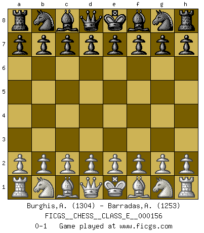 Last move : 0-1 2012 November 2 10:4:40 [Event "FICGS__CHESS__CLASS_E__000156"] [Site "FICGS"] [Date "2012.09.23"] [Round "1"] [White "Burghis,Alexandru"] [Black "Barradas,Anderson"] [Result "0-1"] [WhiteElo "1304"] [BlackElo "1253"] 0-1 This chess game has been lost on time (started : 2012.09.23 7:53:57) Player Black won this chess game. Follow this game move after move (download)The sign of a great Master is his ability to win a won game quickly and painlessly. (Irving Chernev) Im Wettkampf zwischen starken Meistern kommen Fehler sehr selten vor, deshalb ist es mit bloßem Warten nicht getan. (José Raúl Capablanca) No es suficiente ser un buen jugador, se debe también de jugar bién. (Siegbert Tarrasch) Les échecs sont un jeu par leur forme, un art par leur essence et une science par sa difficulté d'acquisition. Ils peuvent vous procurer autant de plaisir qu'un bon livre ou une belle musique, mais vous n'aurez une réelle joie que si vous arrivez à bien jouer. (Tigran Petrosian) If we don't succeed, we run the risk of failure. (George W. Bush)