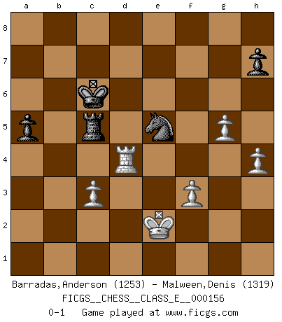 Last move : 0-1 2012 December 3 4:24:46 [Event "FICGS__CHESS__CLASS_E__000156"] [Site "FICGS"] [Date "2012.09.23"] [Round "1"] [White "Barradas,Anderson"] [Black "Malween,Denis"] [Result "0-1"] [WhiteElo "1253"] [BlackElo "1319"] 1.e4 e5 2.Nf3 Nc6 3.d4 exd4 4.Nxd4 Nxd4 5.Qxd4 Qf6 6.Qc4 Qd6 7.a3 Qc5 8.b4 Qxc4 9.Bxc4 a5 10.b5 Bc5 11.O-O d6 12.Nc3 c6 13.bxc6 bxc6 14.Na4 Bd4 15.c3 Ba7 16.Bf4 Ke7 17.Rad1 Bc5 18.Nxc5 dxc5 19.Bd6+ Ke8 20.Bxc5 Be6 21.Bxe6 fxe6 22.Rd6 Kf7 23.Rxc6 Nf6 24.f3 Rhc8 25.Rxc8 Rxc8 26.Bd4 Rc4 27.g4 Ra4 28.Bc5 Rc4 29.Bd4 Ne8 30.h4 Nd6 31.Rb1 Rc7 32.Be5 Rd7 33.Rd1 Ke7 34.Bxg7 Nb5 35.Bf6+ Ke8 36.Rb1 Nxa3 37.Ra1 Nc4 38.Ra4 Rc7 39.Bg5 Kd7 40.Bf4 Rc6 41.e5 Rc5 42.g5 Nxe5 43.Rd4+ Kc6 44.Kf2 Nc4 45.Ke2 e5 46.Bxe5 Nxe5 0-1 Scotch game Kingside Castling by player White (move 11) Player Black won this chess game. Follow this game move after move (download)Life is a kind of Chess, with struggle, competition, good and ill events. (Benjamin Franklin) Woher wissen wir, daß der Neanderthaler Blindschach gespielt hat? -- Bei Ausgrabungen wurden keine Schachbretter und Figuren gefunden. (Anonymous) Cuando la partida de Ajedrez termina, el Peón y el Rey regresan a la misma caja. (Irish saying) Les Echecs, c'est l'art de la guerre sans les charniers, c'est la résurrection des morts tombés au champ d'honneur, l'espoir perpétuel, la suprématie de l'intelligence sur la force, la culture de l'esprit. (F. Szpiner) Fame, I have already. Now I need the money. (an elderly Steinitz)