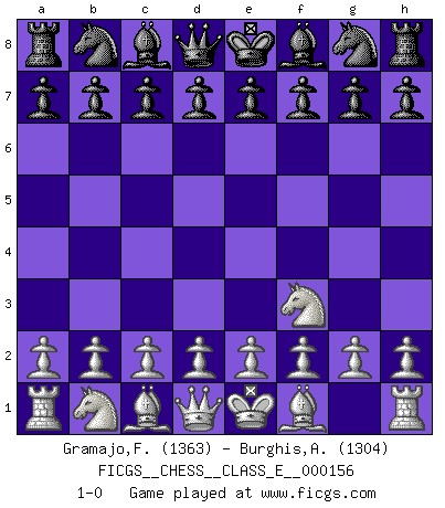 Last move : 1-0 2012 November 3 10:10:20 [Event "FICGS__CHESS__CLASS_E__000156"] [Site "FICGS"] [Date "2012.09.23"] [Round "1"] [White "Gramajo,Francisco"] [Black "Burghis,Alexandru"] [Result "1-0"] [WhiteElo "1363"] [BlackElo "1304"] 1.Nf3 1-0 This chess game has been lost on time (started : 2012.09.23 7:53:57) Reti Opening Player White won this chess game. Follow this game move after move (download)We like to think. (Gary Kasparov) Du musst Deinen Gegner in einen tiefen dunklen Wald führen wo 2+2=5 ist und wo der Weg, der wieder hinausführt, nur breit genug für einen ist. (Mikhail Nekhemyevich Tal) El Ajedrez es como la guerra en un tablero. (Bobby Fischer) Il n'y a plus de joueurs du niveau de Jacob Murray dont la seule quête est le beau jeu, le plaisir de voir les pièces construire quelque chose. Sur 10 idées à la minute, 9 seront sans intérêt, la dernière s'avèrera géniale. (Christian Bauer) There are more things in heaven and earth than practically anywhere else. (Unknown)