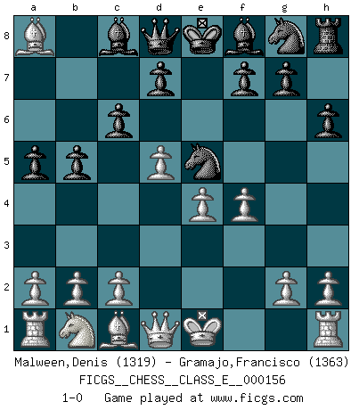 Last move : 1-0 2012 December 21 22:49:29 [Event "FICGS__CHESS__CLASS_E__000156"] [Site "FICGS"] [Date "2012.09.23"] [Round "1"] [White "Malween,Denis"] [Black "Gramajo,Francisco"] [Result "1-0"] [WhiteElo "1319"] [BlackElo "1363"] 1.e4 e5 2.Nf3 Nc6 3.Bb5 a6 4.Ba4 b5 5.Bb3 a5 6.Bd5 h6 7.Nxe5 Nxe5 8.Bxa8 c6 9.d4 Ng6 10.d5 Ne5 11.f4 1-0 Ruy Lopez : Caro variation Player White won this chess game. Follow this game move after move (download)Chess is so inspiring that I do not believe a good player is capable of having an evil thought during the game. (Wilhelm Steinitz) Ein Teil des Fehlers ist immer korrekt. (Savielly Grigorievitsch Tartakower) Yo no creo en la psicología. Yo creo en las buenas movidas. (Bobby Fischer) La victoire dans une partie d'Echecs appartient la plupart du temps à celui qui voit un peu plus loin que l'adversaire. (Lasker) Always two there are. No more no less. A master, and an apprentice. (Master Yoda in Star Wars ep.1)