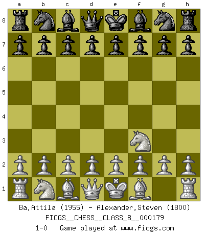 Last move : 1-0 2012 November 3 22:11:34 [Event "FICGS__CHESS__CLASS_B__000179"] [Site "FICGS"] [Date "2012.09.24"] [Round "1"] [White "Ba,Attila"] [Black "Alexander,Steven"] [Result "1-0"] [WhiteElo "1955"] [BlackElo "1800"] 1.Nf3 1-0 This chess game has been lost on time (started : 2012.09.24 10:54:59) Reti Opening Player White won this chess game. Follow this game move after move (download)White lost because he failed to remember the right continuation and had to think up the moves himself. (Siegbert Tarrasch) Spiel ein langweiliges Spiel zu Ende und lustige Dinge können passieren. (Hans Ree) Una mala movida nulifica cuarenta buenas. (Horowitz) Que feriez-vous si vous étiez en train de jouer aux échecs et que la fin du monde arrive ? Je continuerais à jouer. (Saint Borromée) The best teachers teach from the heart, not from the book. (Author unknown)