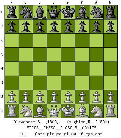 Last move : 0-1 2012 November 3 10:10:20 [Event "FICGS__CHESS__CLASS_B__000179"] [Site "FICGS"] [Date "2012.09.24"] [Round "1"] [White "Alexander,Steven"] [Black "Knighton,Robert"] [Result "0-1"] [WhiteElo "1800"] [BlackElo "1800"] 0-1 This chess game has been lost on time (started : 2012.09.24 10:54:59) Player Black won this chess game. Follow this game move after move (download)Chess is no whit inferior to the violin, and we have a large number of professional violinists. (Mikhail Botvinnik) Wie gewinnt Tal? Er entwickelt alle seine Figuren in die Brettmitte und opfert sie dann irgendwo. (Robert James Fischer) No volvere nunca a jugar contigo. Has insultado a mi amigo. - cuando un oponente se maldijo por una mala jugada (Miguel Najdorf) Lorsque vous vous retrouvez devant une position atroce, ne tendez pas un ultime piège dérisoire avec l'intention d'abandonner si l'adversaire le déjoue ! Faites-vous plutôt un devoir de résister comme si votre vie en dépendait. Jouez le coup qui vous déplairait au centuple si vous étiez dans la peau de votre tortionnaire ! Unless I accept my faults I will most certainly doubt my virtues. (Hugh Prather)