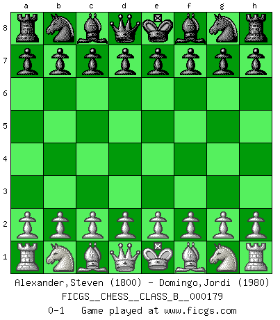 Last move : 0-1 2012 November 3 10:10:20 [Event "FICGS__CHESS__CLASS_B__000179"] [Site "FICGS"] [Date "2012.09.24"] [Round "1"] [White "Alexander,Steven"] [Black "Domingo,Jordi"] [Result "0-1"] [WhiteElo "1800"] [BlackElo "1980"] 0-1 This chess game has been lost on time (started : 2012.09.24 10:54:59) Player Black won this chess game. Follow this game move after move (download)Examine moves that smite! A good eye for smites is far more important than a knowledge of strategical principles. (Purdy) Ich organisiere ein großes Turnier, was mich etwa 120000 Dollar kostet. Ich denke, das ist das erste Mal in der Schachgeschichte, daß ein Schachgroßmeister auch als Mäzen auftritt. (Miguel Najdorf) Yo no creo en la psicología. Yo creo en las buenas movidas. (Bobby Fischer) On entre au jeu d'Echecs comme on entre en Religion. Pour le joueur d'Echecs, la partie d'Echecs c'est l'office, la messe, le défilé du 1er Mai, le dépôt de gerbe au Monument aux Morts. C'est un drame sacré. (Michel Roos) Memory... is the diary that we all carry with us. (Oscar Wilde, The Importance of Being Earnest)