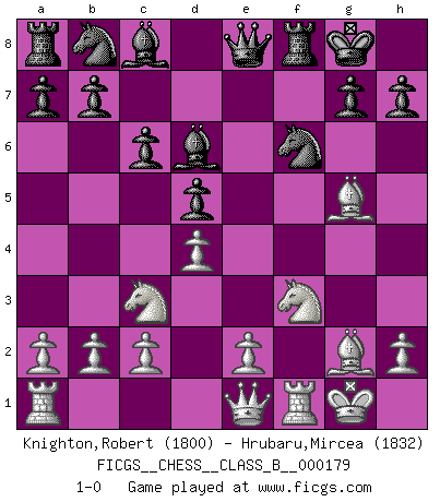 Last move : 1-0 2013 February 24 16:16:9 [Event "FICGS__CHESS__CLASS_B__000179"] [Site "FICGS"] [Date "2012.09.24"] [Round "1"] [White "Knighton,Robert"] [Black "Hrubaru,Mircea"] [Result "1-0"] [WhiteElo "1800"] [BlackElo "1832"] 1.g4 d5 2.Bg2 c6 3.g5 e5 4.d4 e4 5.Nc3 Bd6 6.f3 f5 7.gxf6 Nxf6 8.Bg5 exf3 9.Nxf3 O-O 10.O-O Qe8 11.Qe1 1-0 This chess game has been lost on time (started : 2012.09.24 10:54:59) Grob : Spike attack Kingside Castling by player Black (move 9) Kingside Castling by player White (move 10) Player White won this chess game. Follow this game move after move (download)Chess is war over the board. The object is to crush the opponents mind. (Bobby Fischer) Wer mein Gambit spielt, muß bereit sein, alle Brücken hinter sich abzubrechen. Es verändert den ganzen Menschen. Es wirkt wie ein Zauberstab und fördert verkümmerte, gute Charakter- eigenschaften wieder zu Tage. (Emil Joseph Diemer) Me gusta decir que Bobby Fischer fue el mejor jugador que jamás haya existido. Pero lo que hizo de Fischer un genio, fue su habilidad de mezclar una frescura y pragmatismo Americano con ideas Rusas acerca de la estrategia. (Bruce Pandolfini) Toute estimation doit être constamment réévaluée. (Jacob Estrin) Panic is a sudden desertion of us, an a going over to the enemy of our imagination. (Christian Nevell Bovee)