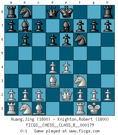 Last move : 0-1 2013 January 7 23:45:26 [Event "FICGS__CHESS__CLASS_B__000179"] [Site "FICGS"] [Date "2012.09.24"] [Round "1"] [White "Huang,Jing"] [Black "Knighton,Robert"] [Result "0-1"] [WhiteElo "1800"] [BlackElo "1800"] 1.e4 b6 2.d4 Bb7 3.Bd3 Nf6 4.Qe2 e6 5.Nf3 Be7 6.O-O d6 0-1 This chess game has been lost on time (started : 2012.09.24 10:54:59) Owen defense Kingside Castling by player White (move 6) Player Black won this chess game. Follow this game move after move (download)Don't even mention losing to me. I can't stand to think of it. (Bobby Fischer) Die FIDE ist dabei in die Hände der russischen Mafia zu fallen. (Larry Evans) El Ajedrez es un terrible juego. Si no controlas el centro, tu oponente tiene una posición mas holgada. Si tienes control del centro, ¡entonces realmente tu tienes algo de que preocuparte!. (Siegbert Tarrasch) Les Echecs, c'est l'art de la guerre sans les charniers, c'est la résurrection des morts tombés au champ d'honneur, l'espoir perpétuel, la suprématie de l'intelligence sur la force, la culture de l'esprit. (F. Szpiner) The Movers & Shakers of this world are those who play chess in the mornings and go to the disco in the evenings. (Dinesh De Silva)
