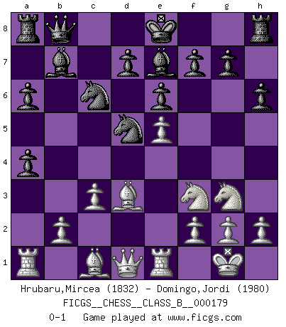 Last move : 0-1 2013 March 17 18:6:50 [Event "FICGS__CHESS__CLASS_B__000179"] [Site "FICGS"] [Date "2012.09.24"] [Round "1"] [White "Hrubaru,Mircea"] [Black "Domingo,Jordi"] [Result "0-1"] [WhiteElo "1832"] [BlackElo "1980"] 1.d4 b5 2.e4 a6 3.Nf3 Bb7 4.Bd3 e6 5.O-O c5 6.c3 Nf6 7.Re1 h6 8.e5 Nd5 9.dxc5 Bxc5 10.Nbd2 Nc6 11.a4 Qb8 12.Ne4 Be7 13.Ng3 bxa4 0-1 This chess game has been lost on time (started : 2012.09.24 10:54:59) Polish defense Kingside Castling by player White (move 5) Player Black won this chess game. Follow this game move after move (download)All I want to do, ever, is just play Chess. (Bobby Fischer) Weshalb minderdergeübte Spieler mit g2-g4 beginnen? Die betreffenden sind unschlüssig, ob sie nun rechts (h4) oder links (f4) beginnen sollen, und in ihrer Ratlosigkeit entschliessen sie sich nach guter Bürgerart dazu, den goldenen Mittelweg zu wählen. (Aaron Nimzowitsch) Del Ajedrez se ha dicho que la vida no es lo suficientemente larga para él, pero eso es culpa de la vida, no del Ajedrez. (William Ewart Napier) L'action d'une oeuvre littéraire se déroule sur un champ de bataille. Les masques et les types du drame moderne correspondent aux pièces du jeu d'échecs. L'intrigue correspond aux coups et aux gambits, c'est à dire aux techniques du jeu telles qu'utilisées et interprétées par les joueurs. Les tactiques et les péripéties [mouvements] correspondent aux coups exécutés par l'adversaire. (Viktor Shklovsky) The beginning is the most important part of the work. (Plato)