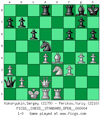Last move : 1-0 2012 December 27 12:58:26 [Event "FICGS__CHESS__STANDARD_OPEN__000004"] [Site "FICGS"] [Date "2012.09.24"] [Round "2"] [White "Kokoryukin,Sergey"] [Black "Perikov,Yuriy"] [Result "1-0"] [WhiteElo "2179"] [BlackElo "2210"] 1.d4 Nf6 2.c4 e6 3.Nf3 d5 4.Nc3 c6 5.Bg5 h6 6.Bxf6 Qxf6 7.Qc2 Nd7 8.e4 Qg6 9.cxd5 exd5 10.O-O-O dxe4 11.Nxe4 Be7 12.Bd3 O-O 13.Ng3 Qd6 14.Nf5 Qf6 15.Kb1 Nb6 16.Ne5 Nd5 17.a3 Bd6 18.Nxd6 Qxd6 19.Rhe1 Be6 20.g4 Rad8 21.h4 Nf4 22.Bh7+ Kh8 23.Be4 f6 24.Nc4 Qd7 25.f3 Bg8 26.Ne3 Qf7 27.Qh2 Qa2+ 28.Kc1 Nd5 29.Qd2 1-0 Queen's pawn game Queenside Castling by player White (move 10) Kingside Castling by player Black (move 12) Player White won this chess game. Follow this game move after move (download)You must take your opponent into a deep dark forest where 2+2=5, and the path leading out is only wide enough for one. (Mikhail Tal) Schach ist das schnellste Spiel der Welt, weil man in jeder Sekunde Tausende von Gedanken ordnen muß. (Albert Einstein) a manera como él juega al Ajedrez, demuestra la completa naturaleza de un hombre. (Stanley Ellin) La vie et les Echecs sont tous les deux une lutte constante. (Lasker) Good luck. You're gonna need it. (Han Solo in Star Wars ep.6)