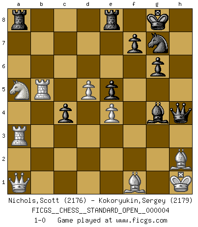 Last move : 1-0 2013 March 17 18:6:50 [Event "FICGS__CHESS__STANDARD_OPEN__000004"] [Site "FICGS"] [Date "2012.09.24"] [Round "2"] [White "Nichols,Scott"] [Black "Kokoryukin,Sergey"] [Result "1-0"] [WhiteElo "2176"] [BlackElo "2179"] 1.e4 g6 2.c3 Bg7 3.d4 d6 4.Nf3 Nf6 5.Bd3 O-O 6.O-O Nbd7 7.Re1 e5 8.Nbd2 Re8 9.a4 c6 10.a5 Qc7 11.h3 Rb8 12.Nc4 b5 13.axb6 axb6 14.b4 b5 15.Na5 exd4 16.cxd4 c5 17.Bf4 Nh5 18.Bh2 c4 19.Bf1 Bf8 20.g4 Ng7 21.d5 Ne5 22.Nd4 Bd7 23.Ra3 h5 24.f4 hxg4 25.fxe5 dxe5 26.Ndc6 Bxb4 27.Nxb4 Qc5+ 28.Kh1 Qxb4 29.Qa1 Ra8 30.hxg4 Bxg4 31.Rb1 Qc5 32.Bg1 Qe7 33.Rxb5 Qh4+ 34.Bh2 1-0 Robatsch (Modern) defense Kingside Castling by player Black (move 5) Kingside Castling by player White (move 6) Player White won this chess game. Follow this game move after move (download)Chess is above all, a fight ! (Emanuel Lasker) Wenn Spassky eine Figur opfert kannst du genauso gut aufgeben. Aber wenn Tal eine Figur opfert, spiel weiter. Er könnte noch eine weitere opfern, und dann ... wer weiß? (Miguel Najdorf) Yo siempre he tenido un ligero sentimiento de lástima por una persona que no tiene conocimiento del Ajedrez. (Siegbert Tarrasch) Lorsque vous vous retrouvez devant une position atroce, ne tendez pas un ultime piège dérisoire avec l'intention d'abandonner si l'adversaire le déjoue ! Faites-vous plutôt un devoir de résister comme si votre vie en dépendait. Jouez le coup qui vous déplairait au centuple si vous étiez dans la peau de votre tortionnaire ! Is not life a hundred times too short to bore ourselves ? (Friedrich Nietzsche)