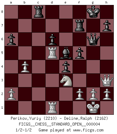 Last move : 1/2-1/2 2012 October 8 5:35:22 [Event "FICGS__CHESS__STANDARD_OPEN__000004"] [Site "FICGS"] [Date "2012.09.24"] [Round "2"] [White "Perikov,Yuriy"] [Black "Deline,Ralph"] [Result "1/2-1/2"] [WhiteElo "2210"] [BlackElo "2162"] 1.e4 c5 2.Nf3 e6 3.d4 cxd4 4.Nxd4 Nf6 5.Nc3 Nc6 6.Ndb5 d6 7.Bf4 e5 8.Bg5 a6 9.Na3 b5 10.Bxf6 gxf6 11.Nd5 f5 12.c3 Bg7 13.exf5 Bxf5 14.Nc2 O-O 15.Nce3 Be6 16.Bd3 f5 17.O-O e4 18.Nf4 Bf7 19.Bc2 Qd7 20.Bb3 Rad8 21.Qh5 b4 22.Qh4 Ne7 23.Bxf7+ Rxf7 24.cxb4 Bxb2 25.Rad1 Be5 26.Nfd5 Nxd5 27.Rxd5 Rc8 28.Rfd1 Qe6 29.Qh3 Qg6 1/2-1/2 Sicilian : Anderssen variation Kingside Castling by player Black (move 14) Kingside Castling by player White (move 17) This chess game ended in a draw. Follow this game move after move (download)Place the contents of the Chess box in a hat, shake them up vigorously, pour them on the board from a height of two feet, and you get the style of Steinitz. (H. E. Bird) Kann Schach nicht schließlich das Nationalspiel der Deutschen werden? Und welche weiteren Ausblicke bieten sich dann dar! Welche Hebung des allgemeinen Kultur-Niveaus, ja der Moral, wenn das Schachbrett den Kartentisch verdrängen würde! Wahrlich, ein Ziel, des Schweißes der Edlen wert! (Siegbert Tarrasch) Yo nunca en mi vida he jugado la Defensa Francesa, que viene siendo la más aburrida de todas las Aperturas. (Wilhelm Steinitz) On entre au jeu d'Echecs comme on entre en Religion. Pour le joueur d'Echecs, la partie d'Echecs c'est l'office, la messe, le défilé du 1er Mai, le dépôt de gerbe au Monument aux Morts. C'est un drame sacré. (Michel Roos) Memory is a complicated thing, a relative to truth, but not its twin. (Barbara Kingsolver, Animal Dreams)