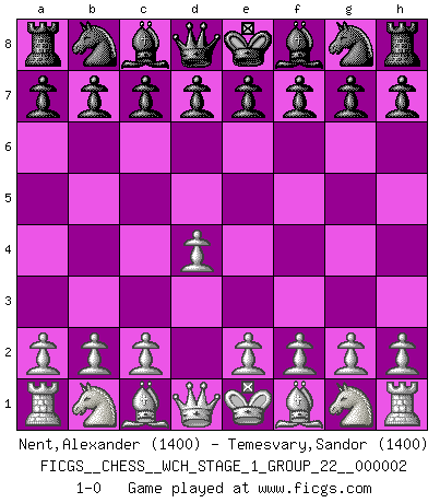 Last move : 1-0 2007 March 1 18:11:49 [Event "FICGS__CHESS__WCH_STAGE_1_GROUP_22__000002"] [Site "FICGS"] [Date "2007.01.16"] [Round "1"] [White "Nent,Alexander"] [Black "Temesvary,Sandor"] [Result "1-0"] [WhiteElo "1400"] [BlackElo "1400"] 1.d4 1-0 This chess game has been lost on time (started : 2007.01.16 15:33:38) Queen's pawn Player White won this chess game. Follow this game move after move (download)All I want to do, ever, is just play Chess. (Bobby Fischer) Kritik überlasse ich den Spießern. Ich zeige nichts, wofür ich mich schämen muss. (Alexandra Kosteniuk) El pensamiento metódico es mas útil en el Ajedrez que la inspiración. (C. J. S. Purdy) Je crois qu'il existe des manières très spécifiques de jouer efficacement contre une machine. Evidemment, nous n'avons aucune chance en technique pure, parce que l'ordinateur calcule de manière parfaite. Mais lorsque nous faisons appel à notre cerveau, en utilisant l'intuition et la compréhension, alors nous restons beaucoup plus forts. (Anatoli Karpov) Panic is a sudden desertion of us, an a going over to the enemy of our imagination. (Christian Nevell Bovee)