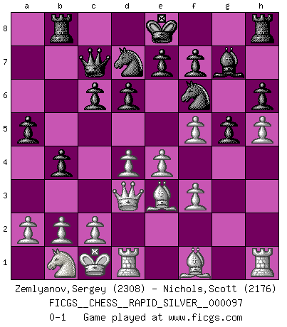 Last move : 0-1 2012 December 4 23:28:6 [Event "FICGS__CHESS__RAPID_SILVER__000097"] [Site "FICGS"] [Date "2012.09.25"] [Round "1"] [White "Zemlyanov,Sergey"] [Black "Nichols,Scott"] [Result "0-1"] [WhiteElo "2308"] [BlackElo "2176"] 1.e4 d6 2.d4 Nf6 3.Nc3 g6 4.Be3 Bg7 5.Qd2 c6 6.f3 b5 7.h4 Nbd7 8.g4 h6 9.h5 g5 10.Nge2 Qc7 11.Ng3 Nb6 12.Nf5 Bxf5 13.gxf5 Rb8 14.O-O-O b4 15.Nb1 Nbd7 16.Qd3 a5 0-1 This chess game has been lost on time (started : 2012.09.25 17:11:31) Pirc defense Queenside Castling by player White (move 14) Player Black won this chess game. Follow this game move after move (download)For me, Chess is life and every game is like a new life. Every Chess player gets to live many lives in one lifetime. (Eduard Gufeld) Mein Name ist Rustam Kamsky. Sie haben meinen Sohn belästigt. Bereiten Sie sich aufs Sterben vor. (Rustam Kamsky) A la fecha, Fischer esta simplemente un nivel arriba de todos los mejores jugadores de Ajedrez del mundo. (John Jacobs) Des points faibles ou des trous dans la position de l'adversaire doivent être occupés par des pièces et non pas par des pions. (Siegbert Tarrasch) Life is like a play: it's not the length but the excellence of the acting that matters. (Seneca)