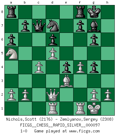 Last move : 1-0 2012 December 5 11:34:3 [Event "FICGS__CHESS__RAPID_SILVER__000097"] [Site "FICGS"] [Date "2012.09.25"] [Round "2"] [White "Nichols,Scott"] [Black "Zemlyanov,Sergey"] [Result "1-0"] [WhiteElo "2176"] [BlackElo "2308"] 1.e4 c5 2.Nf3 d6 3.d4 cxd4 4.Nxd4 Nf6 5.Nc3 a6 6.Be3 e5 7.Nb3 Be6 8.f3 h5 9.Nd5 Bxd5 10.exd5 g6 11.Qd2 Nbd7 12.Be2 Bg7 13.O-O O-O 14.Na5 Qc7 15.c4 e4 16.f4 Ng4 17.Bxg4 hxg4 18.Rad1 1-0 This chess game has been lost on time (started : 2012.09.25 17:11:31) Sicilian : Najdorf, Byrne (English) attack Kingside Castling by player White (move 13) Kingside Castling by player Black (move 13) Player White won this chess game. Follow this game move after move (download)First-class players lose to second class players because second-class players sometimes play a first-class game. (Tarrasch) Garry Kasparov war erst in der Großmeister-Organisation GMA, dann in der Profischach-Vereinigung PCA, zum Schluss kehrte er wieder in den Schoß der FIDE zurück. Aber gut, manche Leute sind flexibel (Viswanathan Anand) Muchos jugadores de Ajedrez se sorprendían cuando después de la partida, Fischer explicaba con calma: 'Yo ya había analizado esta posibilidad' en una posición en la cual yo creía que no era posible de prever desde la apertura. (Mikhail Tal) Il a essayé de se convaincre qu'il pourrait empêcher toutes les erreurs et ne jamais perdre. L'horreur ! Gary Kasparov au sujet de Robert Fischer. Every vice is only an exaggeration of a necessary and virtuous function. (Ralph Waldo Emerson, Journals 1936)