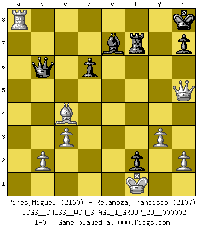 Last move : 1-0 2007 April 19 22:40:55 [Event "FICGS__CHESS__WCH_STAGE_1_GROUP_23__000002"] [Site "FICGS"] [Date "2007.01.16"] [Round "1"] [White "Pires,Miguel"] [Black "Retamoza,Francisco"] [Result "1-0"] [WhiteElo "2160"] [BlackElo "2107"] 1.e4 c5 2.Nf3 Nc6 3.d4 cxd4 4.Nxd4 Nf6 5.Nc3 e5 6.Ndb5 d6 7.Bg5 a6 8.Na3 b5 9.Nd5 Be7 10.Bxf6 Bxf6 11.c3 Bg5 12.Nc2 O-O 13.a4 bxa4 14.Rxa4 a5 15.Bc4 Rb8 16.Ra2 Kh8 17.Nce3 g6 18.O-O f5 19.exf5 gxf5 20.Qh5 e4 21.Rd1 Ne5 22.Be2 Be6 23.Nc4 Nxc4 24.Bxc4 Bxd5 25.Rxd5 Ra8 26.g3 Be7 27.Rxf5 Qb6 28.R2xa5 e3 29.Rf7 exf2+ 30.Kf1 Rxf7 31.Rxa8+ 1-0 Sicilian : Pelikan (Lasker/Sveshnikov) variation Kingside Castling by player Black (move 12) Kingside Castling by player White (move 18) Player White won this chess game. Follow this game move after move (download)The isolated Pawn casts gloom over the entire chessboard. (Aaron Nimzovich) Ich kämpfe solange mein Gegner einen Fehler machen kann. (Emanuel Lasker) Debió haber existido una vez en que los hombres eran semidióses, de otra manera no hubiesen podido inventar el Ajedrez. (Gustav Schenk) Si le désir cupide (et stupide) de gagner est une inépuisable source de souffrance, une combinaison brillante sur l'échiquier est une découverte : le coquelicot qui s'épanouit lorsque apparaît la Voie Lactée. (Arrabal) Gambling : The sure way of getting nothing from something. (Wilson Mizner)