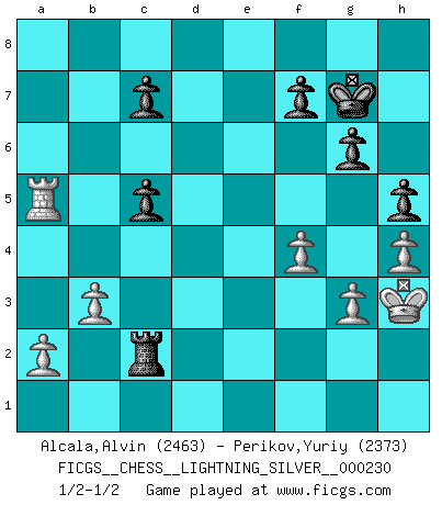 Last move : 1/2-1/2 2012 September 29 19:51:13 [Event "FICGS__CHESS__LIGHTNING_SILVER__000230"] [Site "FICGS"] [Date "2012.09.29"] [Round "1"] [White "Alcala,Alvin"] [Black "Perikov,Yuriy"] [Result "1/2-1/2"] [WhiteElo "2463"] [BlackElo "2373"] 1.c4 Nf6 2.Nc3 e5 3.g3 d5 4.cxd5 Nxd5 5.Bg2 Nf6 6.Nf3 Nc6 7.O-O Be7 8.d3 O-O 9.Nd2 Rb8 10.Nc4 Be6 11.Bxc6 Bxc4 12.dxc4 bxc6 13.Qc2 Qc8 14.Kg2 Qe6 15.Bg5 h6 16.Bxf6 Bxf6 17.Rad1 e4 18.b3 Rfe8 19.e3 a5 20.Ne2 h5 21.Nd4 Qd6 22.h4 Qc5 23.Rd2 Rbd8 24.Rfd1 Rd6 25.Ne2 R8e6 26.Nf4 Re8 27.Kg1 g6 28.Ne2 Kg7 29.Kf1 Rxd2 30.Rxd2 Qf5 31.Qd1 Be7 32.Kg1 Kh7 33.Nf4 Rb8 34.Kg2 Kg7 35.Qc2 Re8 36.c5 Bf6 37.Qc4 Be5 38.Qa4 Bxf4 39.exf4 Qxc5 40.Qd4+ Qxd4 41.Rxd4 e3 42.fxe3 Rxe3 43.Ra4 Rc3 44.Rxa5 Rc2+ 45.Kh3 c5 1/2-1/2 English Opening Kingside Castling by player White (move 7) Kingside Castling by player Black (move 8) This chess game ended in a draw. Follow this game move after move (download)The Pawns are the soul of the game. (Francois Andre Danican Philidor) Sicherlich können nur Meister einen Stil haben. Daß ein nicht-Meister auch nur ein einziges Mal in seinem Leben eine Partie folgerecht durchführte, habe ich niemals bemerkt. (Emanuel Lasker) El Rey es una pieza de pelea. ¡Usenlo!. (Wilhelm Steinitz) Je ne crois pas en la psychologie, je crois aux bons coups. (Robert Fischer) Players are not good because they find tactics, it is about the way to find the positions in which those tactics are hidden. (Luc-Olivier Leclerc)
